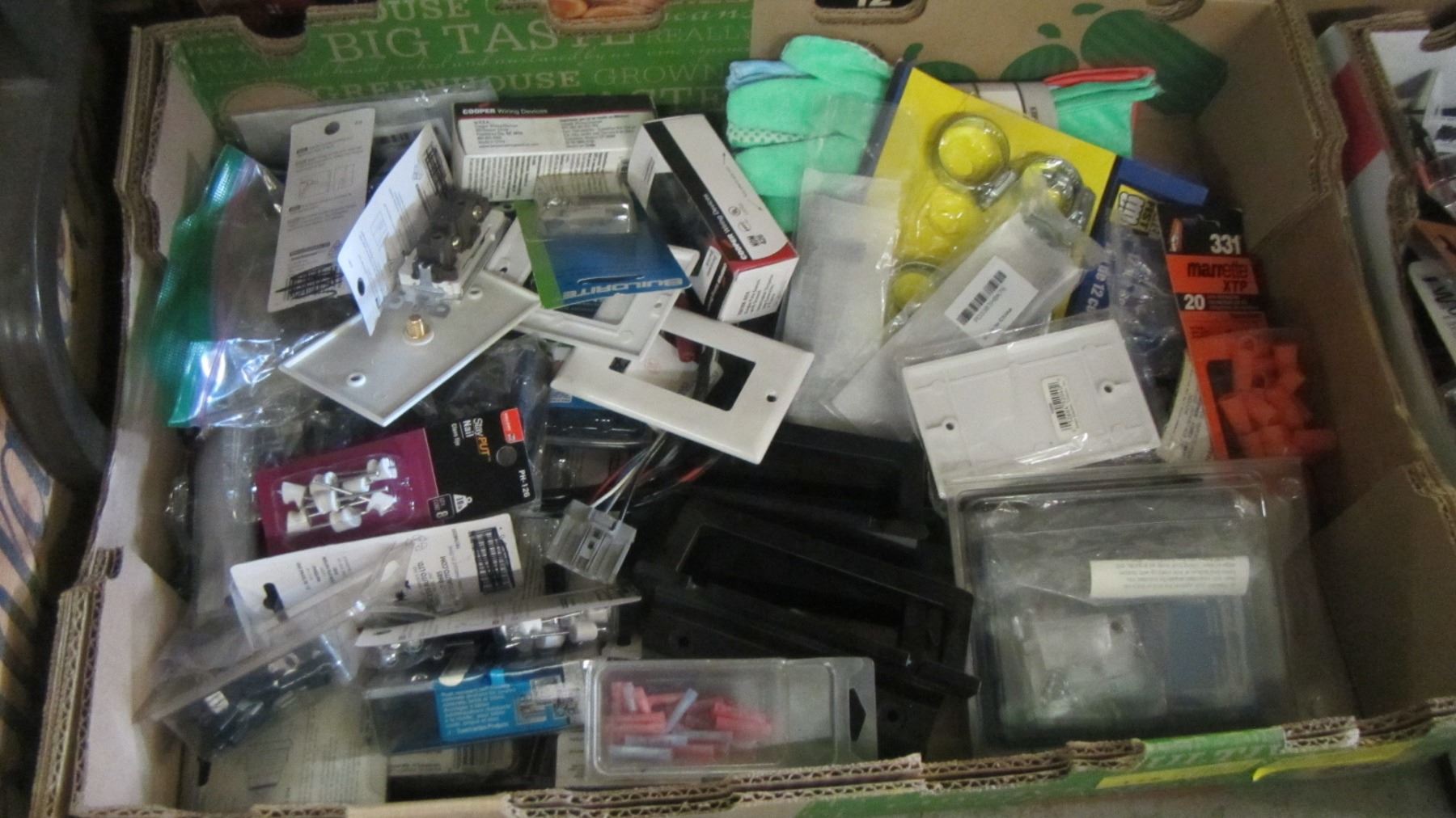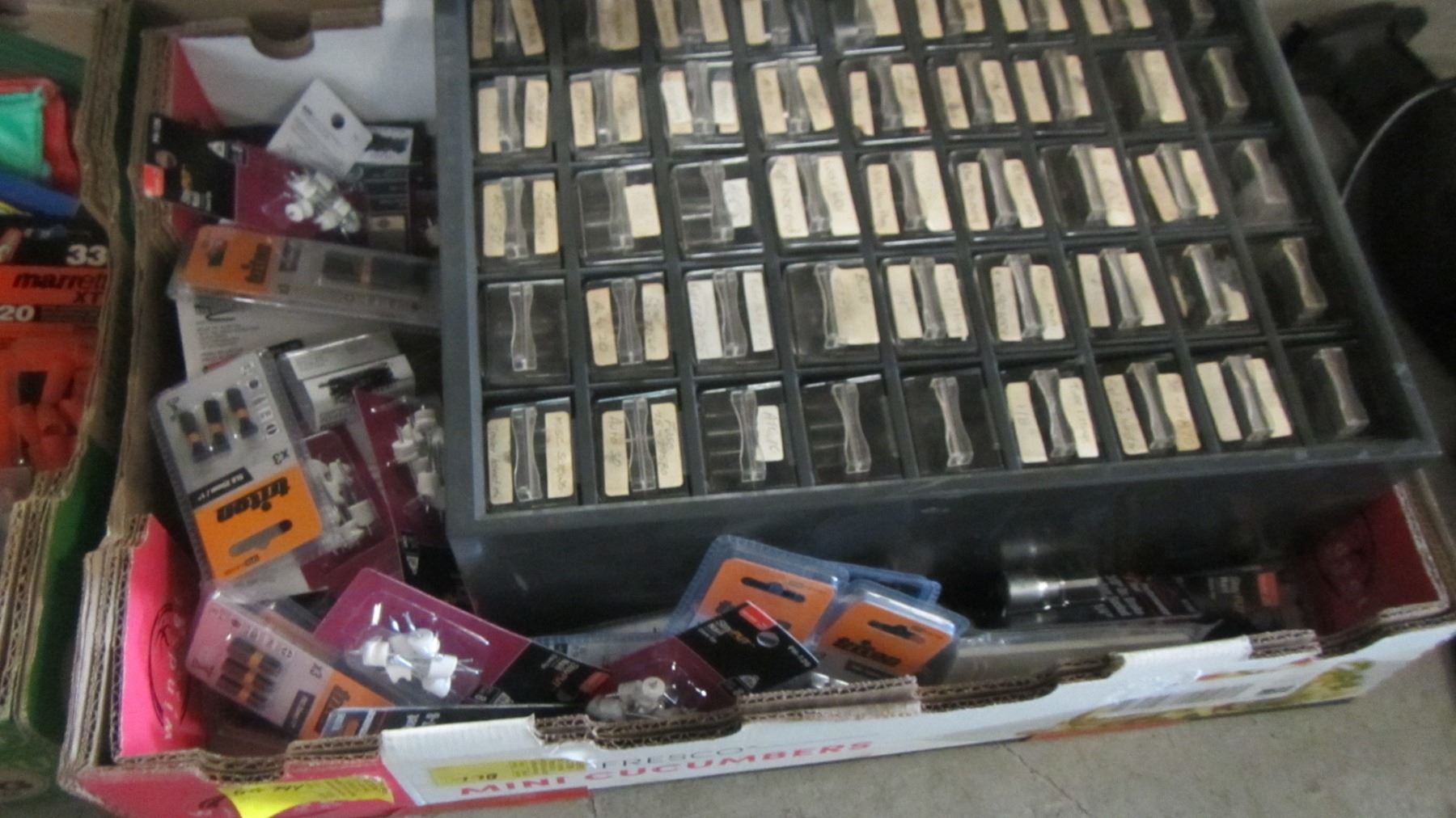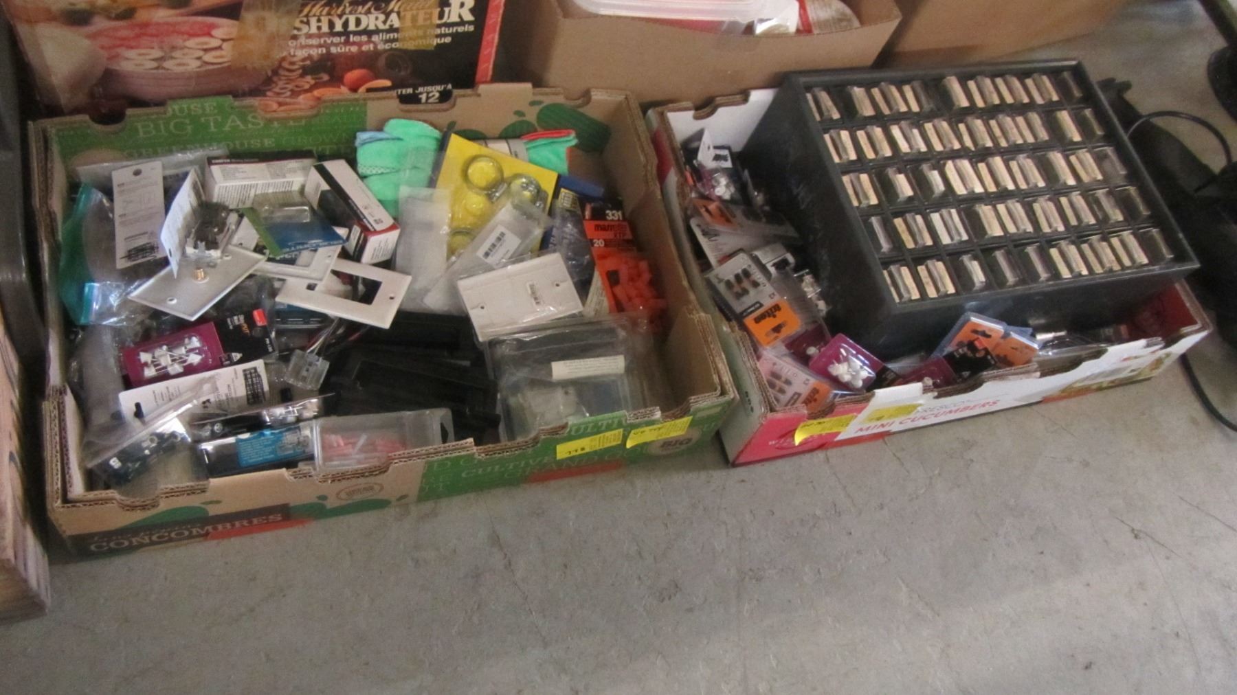 2 BOXES OF MISC. ELECTRICAL, HOSE CLAMPS, MULTI DRAWER STORAGE UNIT, ETC.
