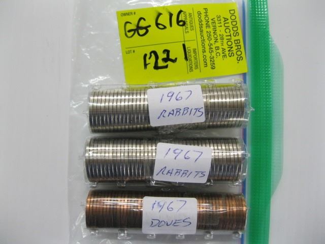2 ROLLS OF 1967 RABBIT NICKLES AND ONE ROLL OF 1967 PENNY DOVES