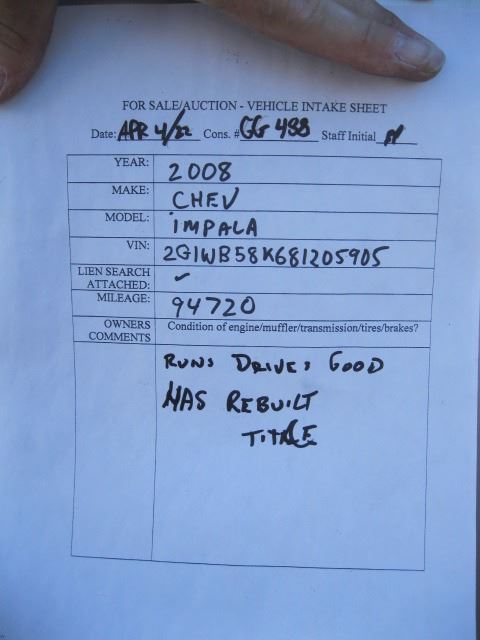 2008 CHEV IMPALA, 94,720KM, REBUILT STATUS, VIN 2G1WB58K681205905