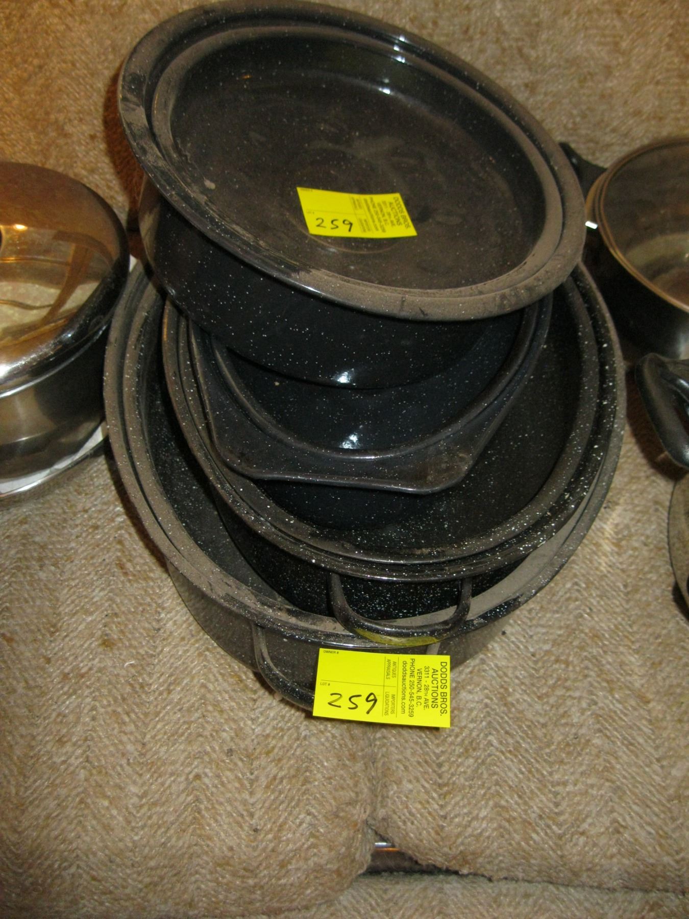 3 - ENAMELLED ROASTER & AN ENAMELLED POT