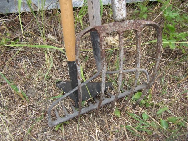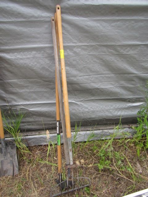 3 GARDEN TOOLS, RAKE, FORK, HOE