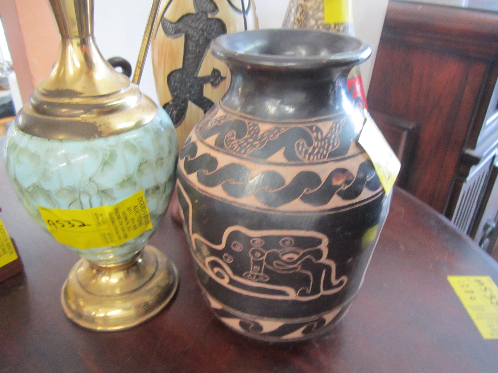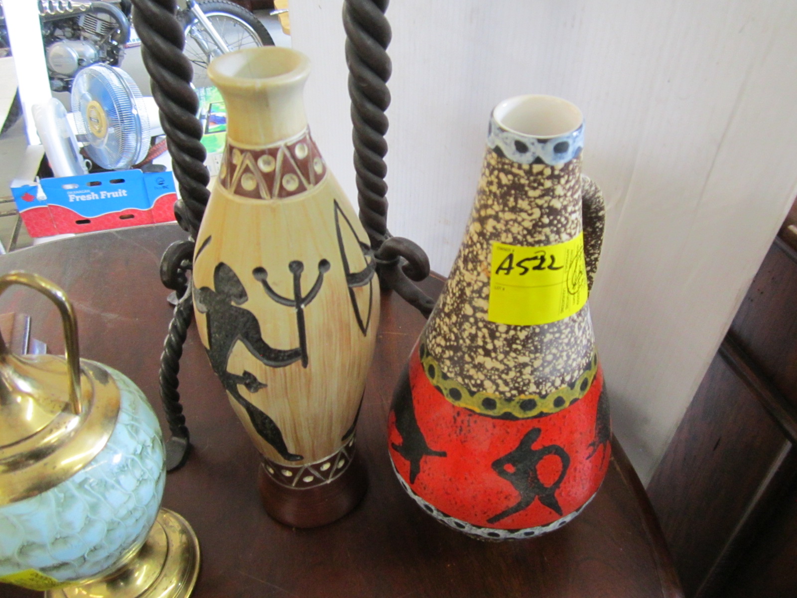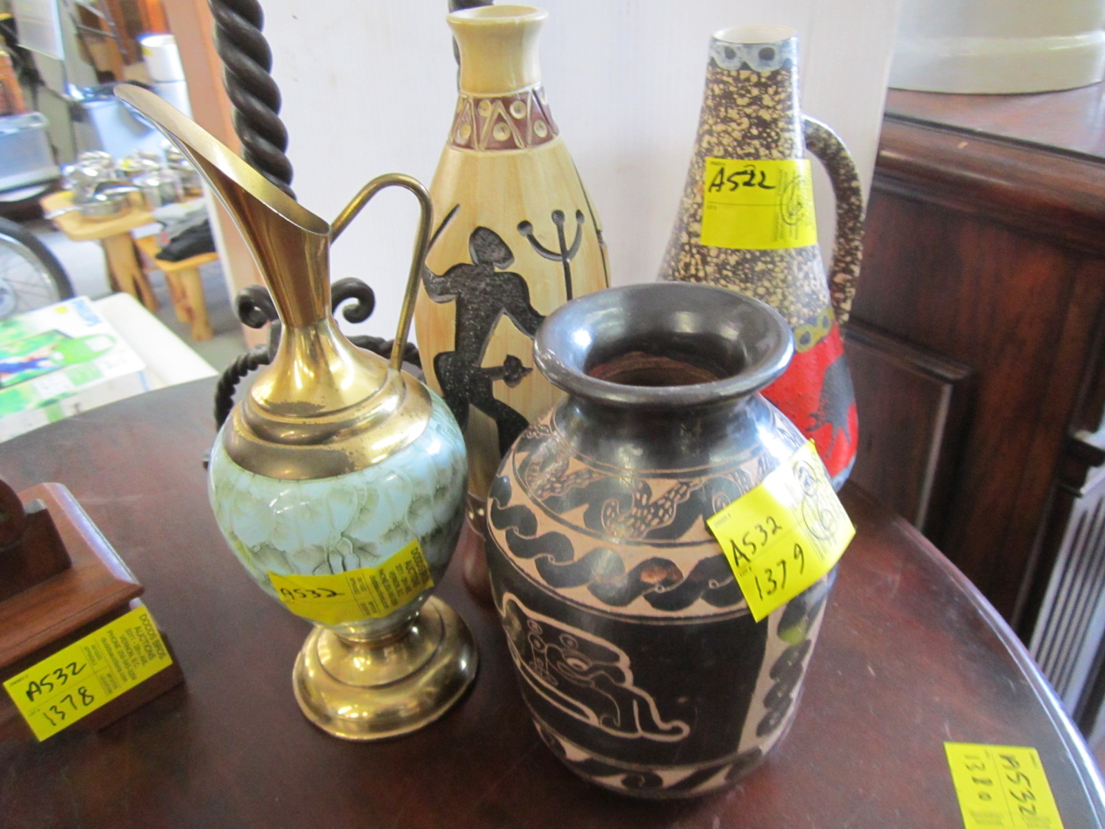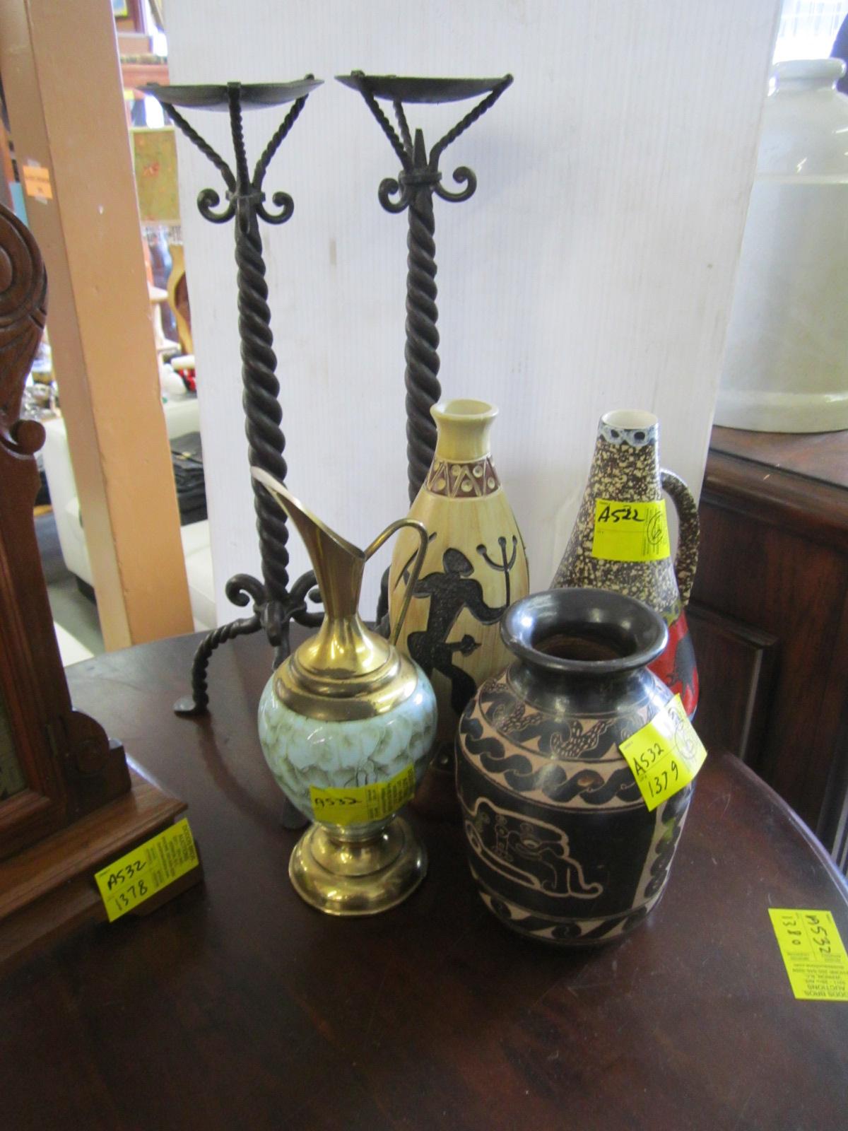4 CERAMIC VASES & 2 METAL CANDLE STANDS