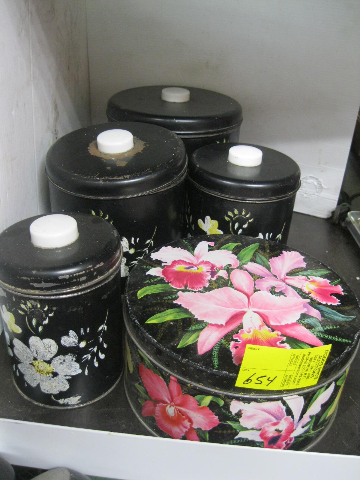4 PIECE CANNISTER SET & A FLOWERED TIN