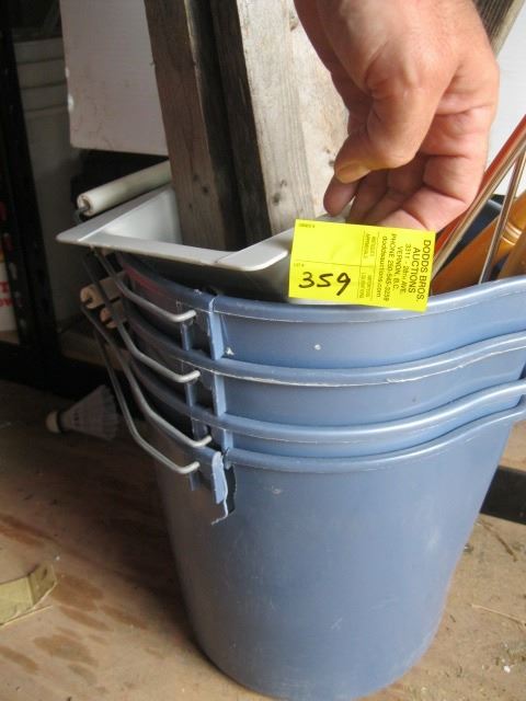 4 PLASTIC BUCKETS W/ASST. HOT DOG COOKERS, ETC.