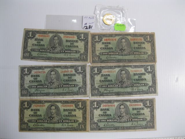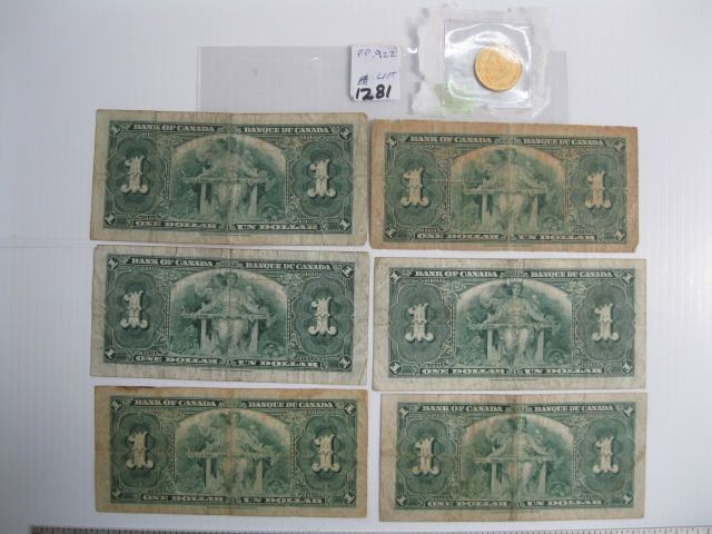 6 EARLY BANK OF CANADA $1 BILLS & A GERMAN COIN