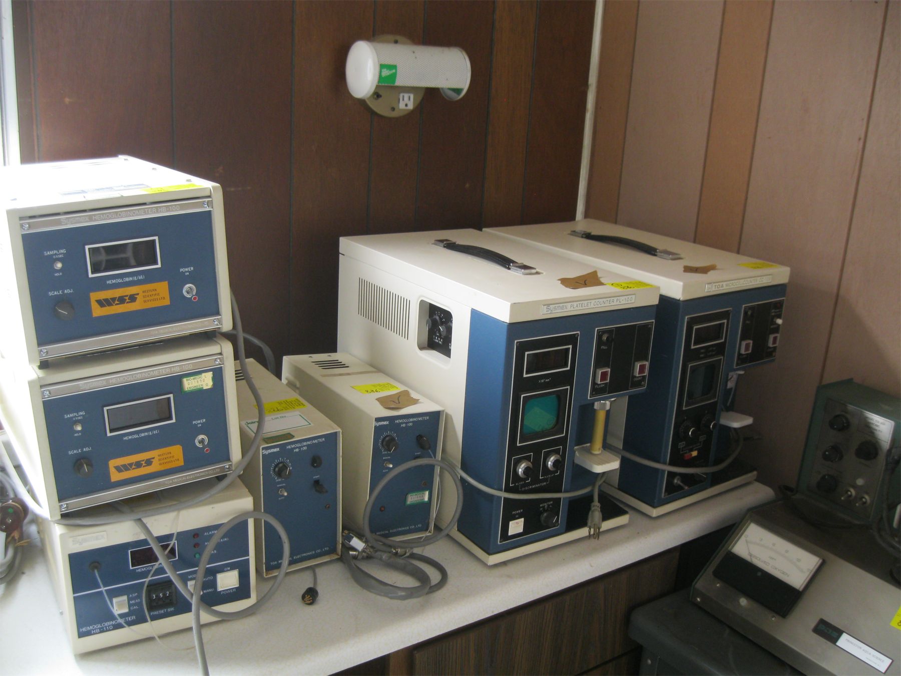 7 PIECES OF SYSTEM X EQUIPMENT: HEMOGLOBIN METER, PLATELET COUNTER, ETC.