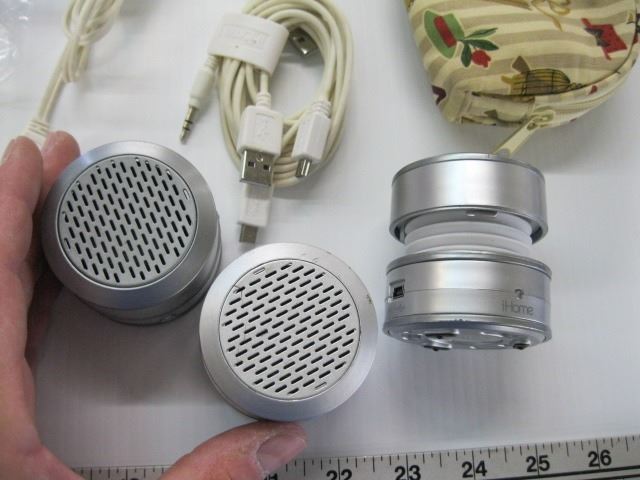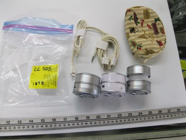 BAG OF SMALL BLUE TOOTH SPEAKERS AND CORDS