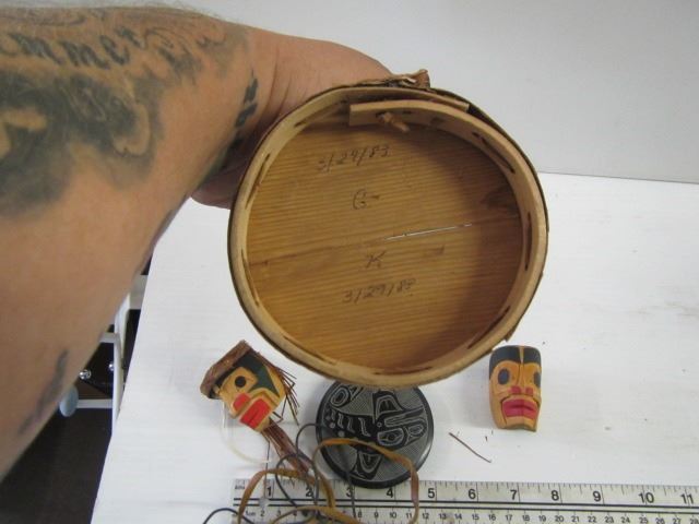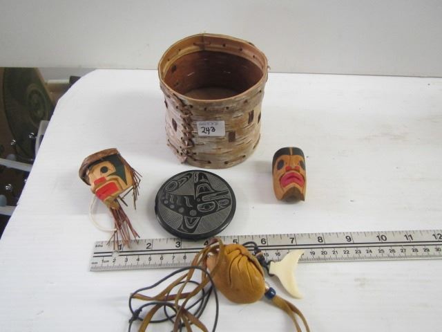 BARK BASKET WITH CARVED TINY MASKS AND MISC