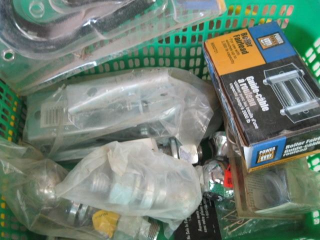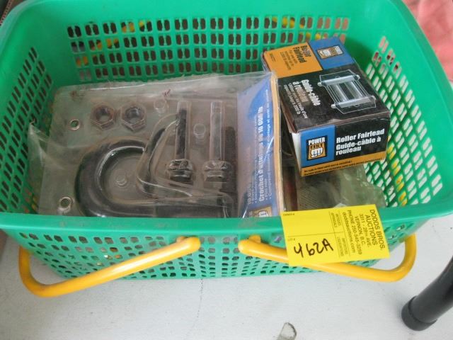 BASKET OF MISC. - VEHICLE TOW HOOK, TRAILER BALLS, ETC.