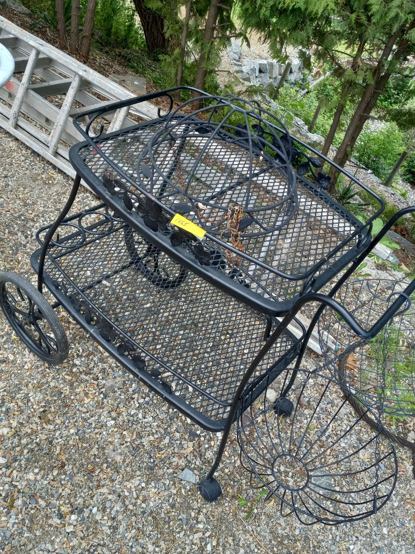 BLACK METAL SERVING CART, 3 METAL HANGING WIRE BASKETS