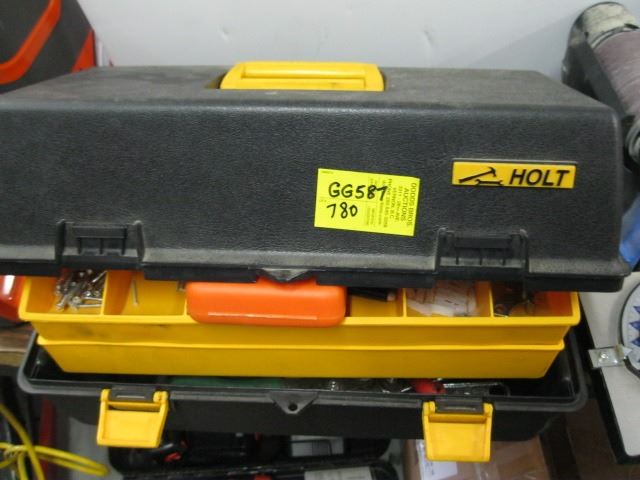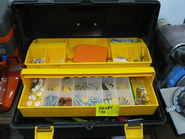 BLACK PLASTIC TOOL BOX WITH ASSORTED CONTENTS