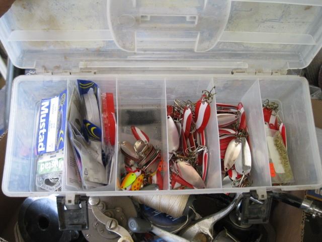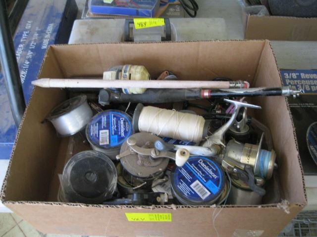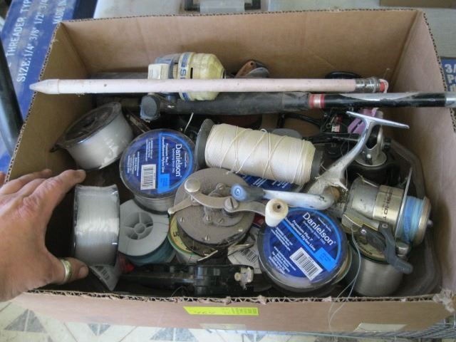 BOX OF ASSORTED FISHING LINE, REELS, ETC. & A FISHING TACKLE BOX W/TACKLE