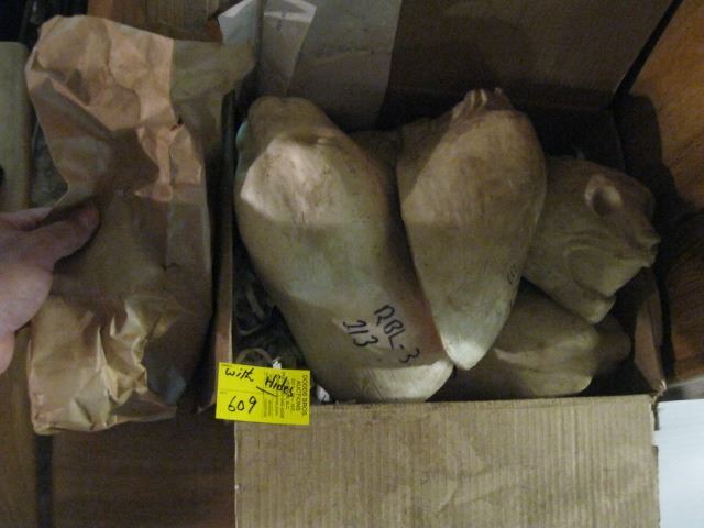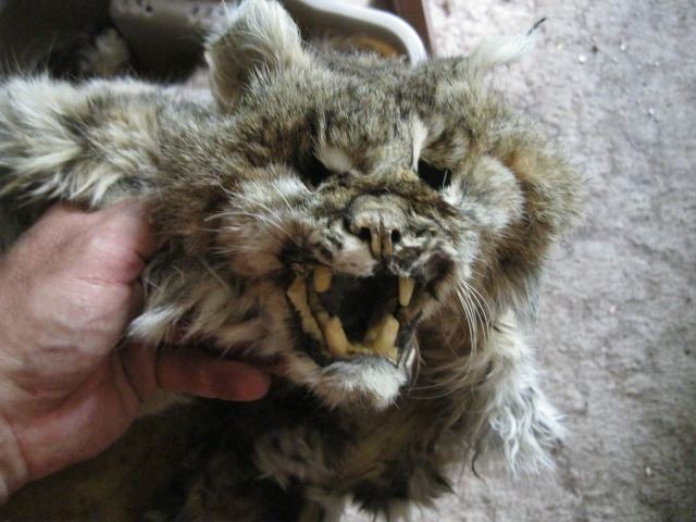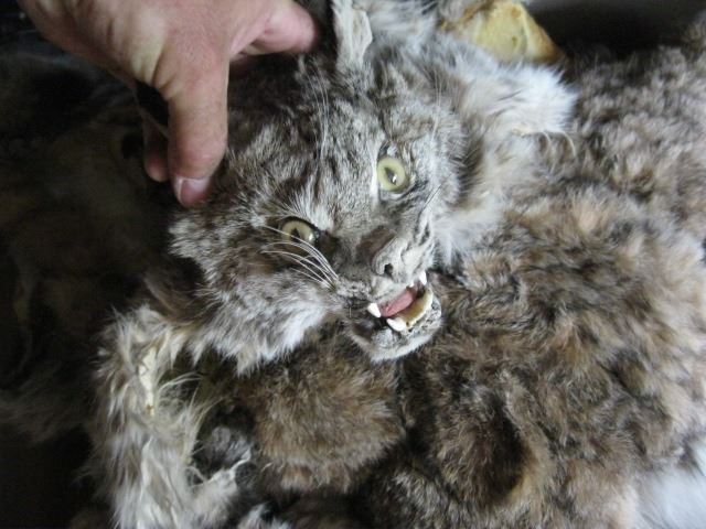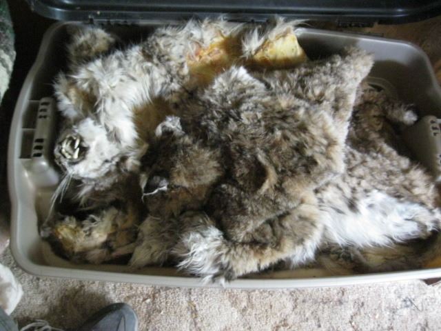 BOX OF BOBCAT HEAD MOUNTS & TUB OF BOBCAT GREEN DRIED HIDES