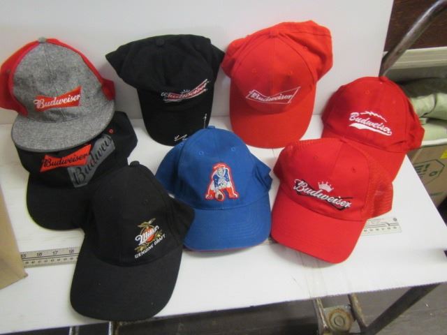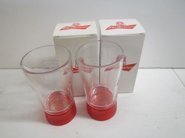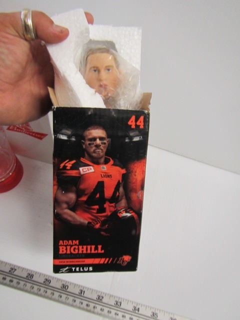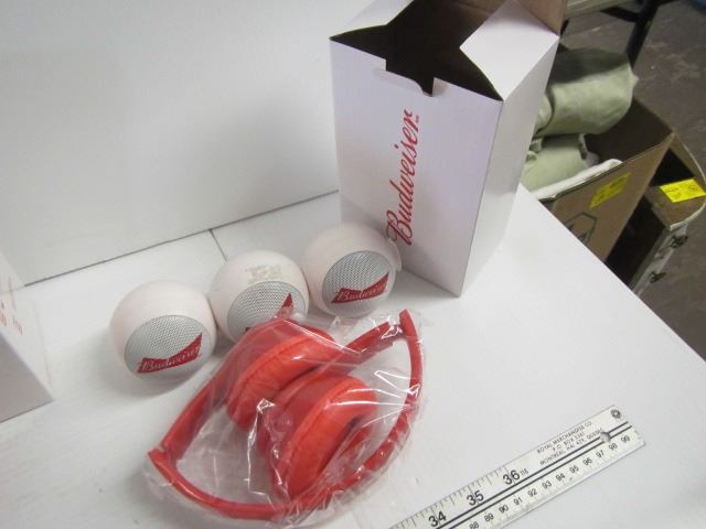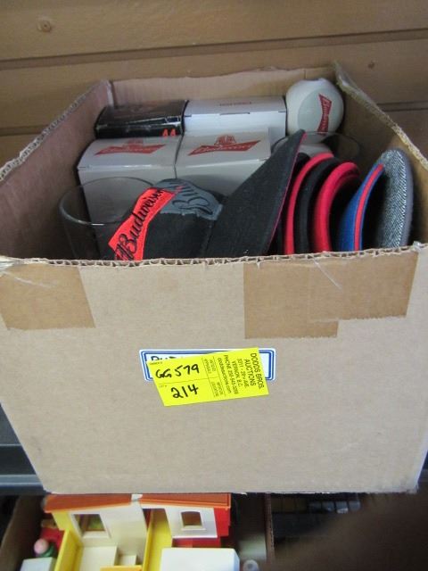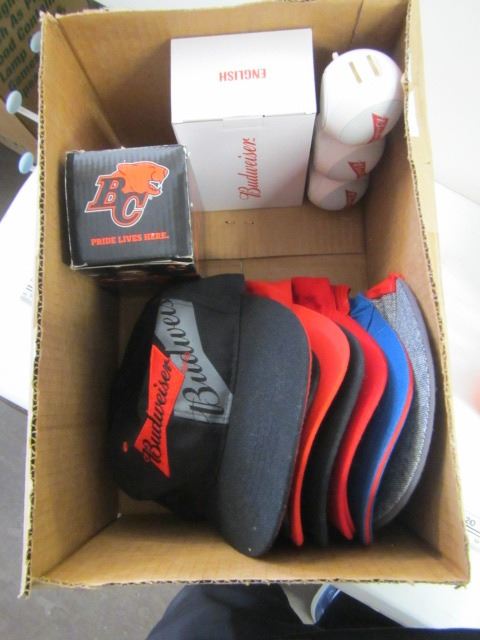 BOX OF BUDWEISER GLASSES, HATS, SPEAKERS AND A BC LIONS FIGURINE