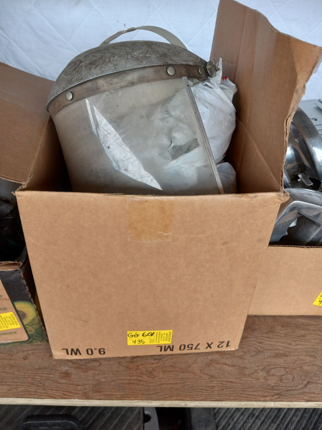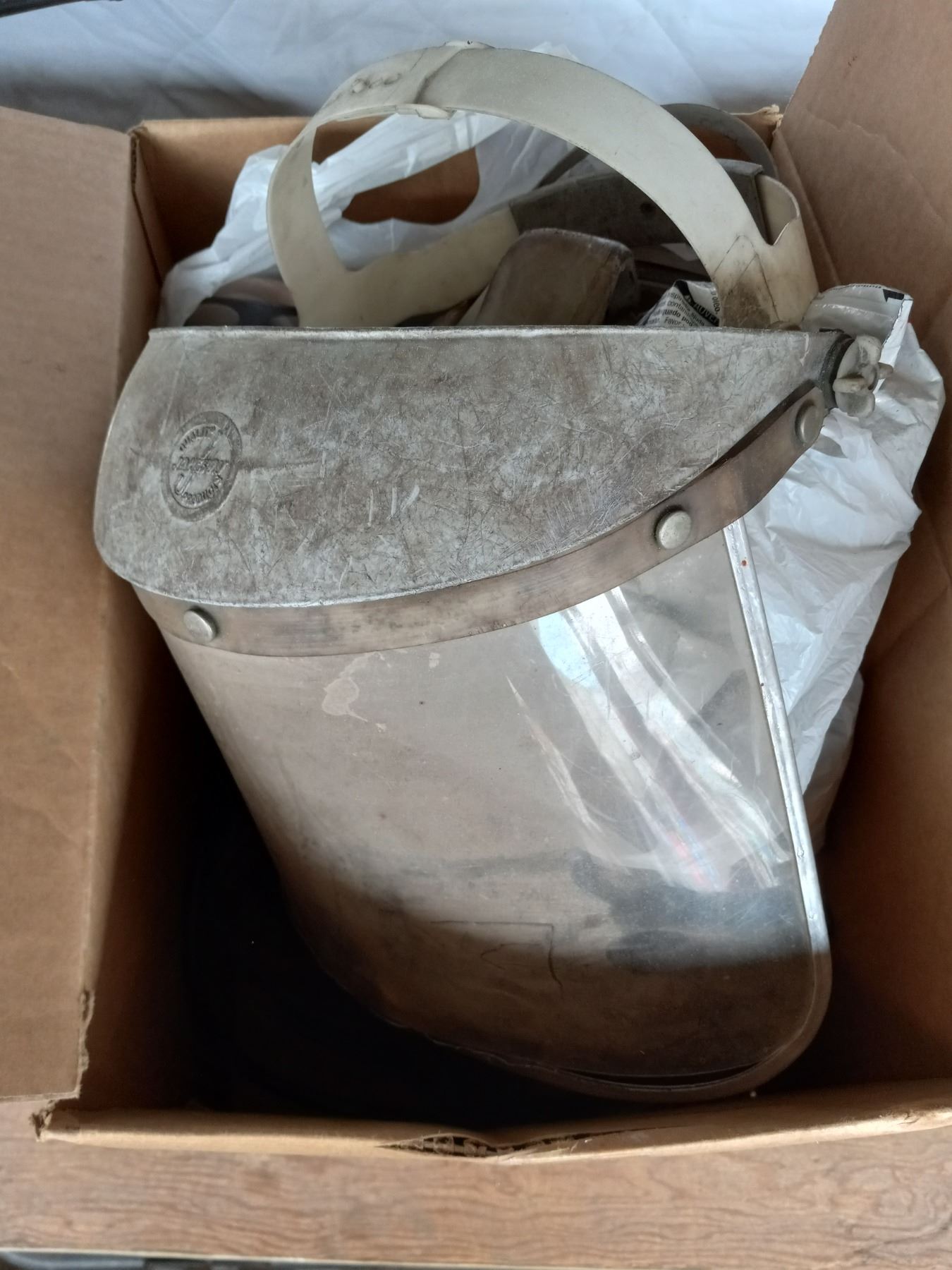 BOX OF CORNER CLAMPS, BREATHE MASKS, FACE SHEILD ETC