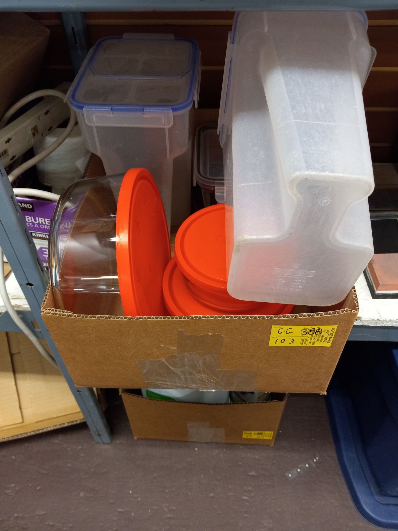 BOX OF GLASS STORAGE CONTAINERS W/PLASTIC LIDS