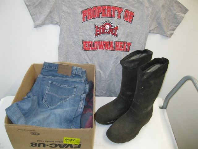 BOX OF MISC. CLOTHES & PAIR OF RUBBER BOOTS