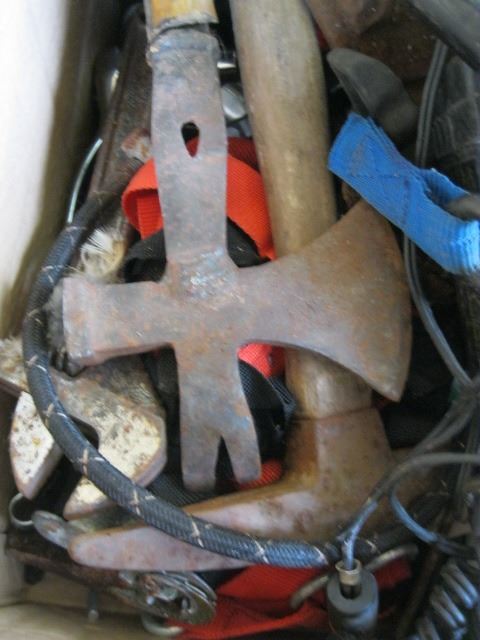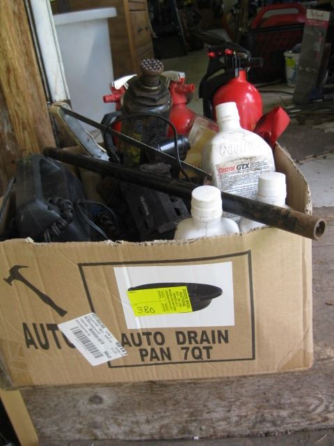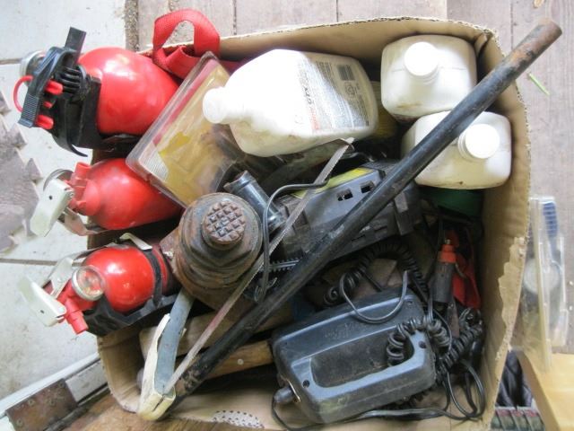 BOX OF MISC. - FIRE EXTINGUISHER, JACKS, AIR MINI COMPRESSORS, ETC.