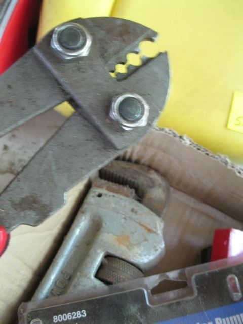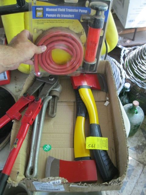 BOX OF MISC. FLUID TRANSFER PUMP, CRIMPERS, NEW HATCHETS, ETC.