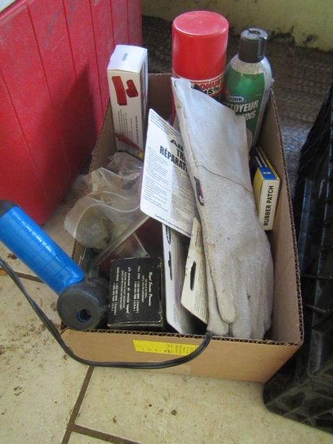 BOX OF MISC. - GLUE GUN, LEATHER GLOVES, BEARING KITS, ETC.