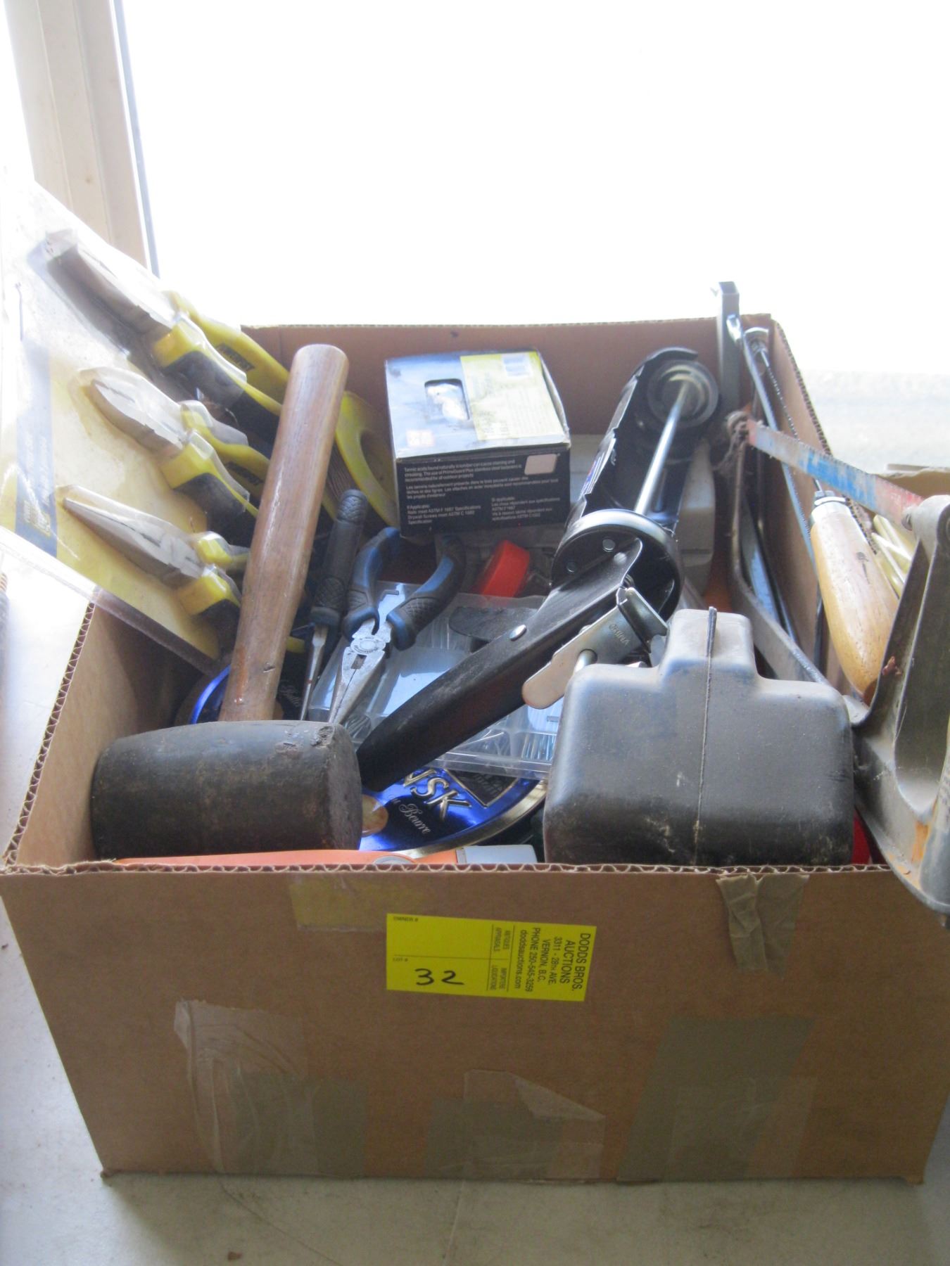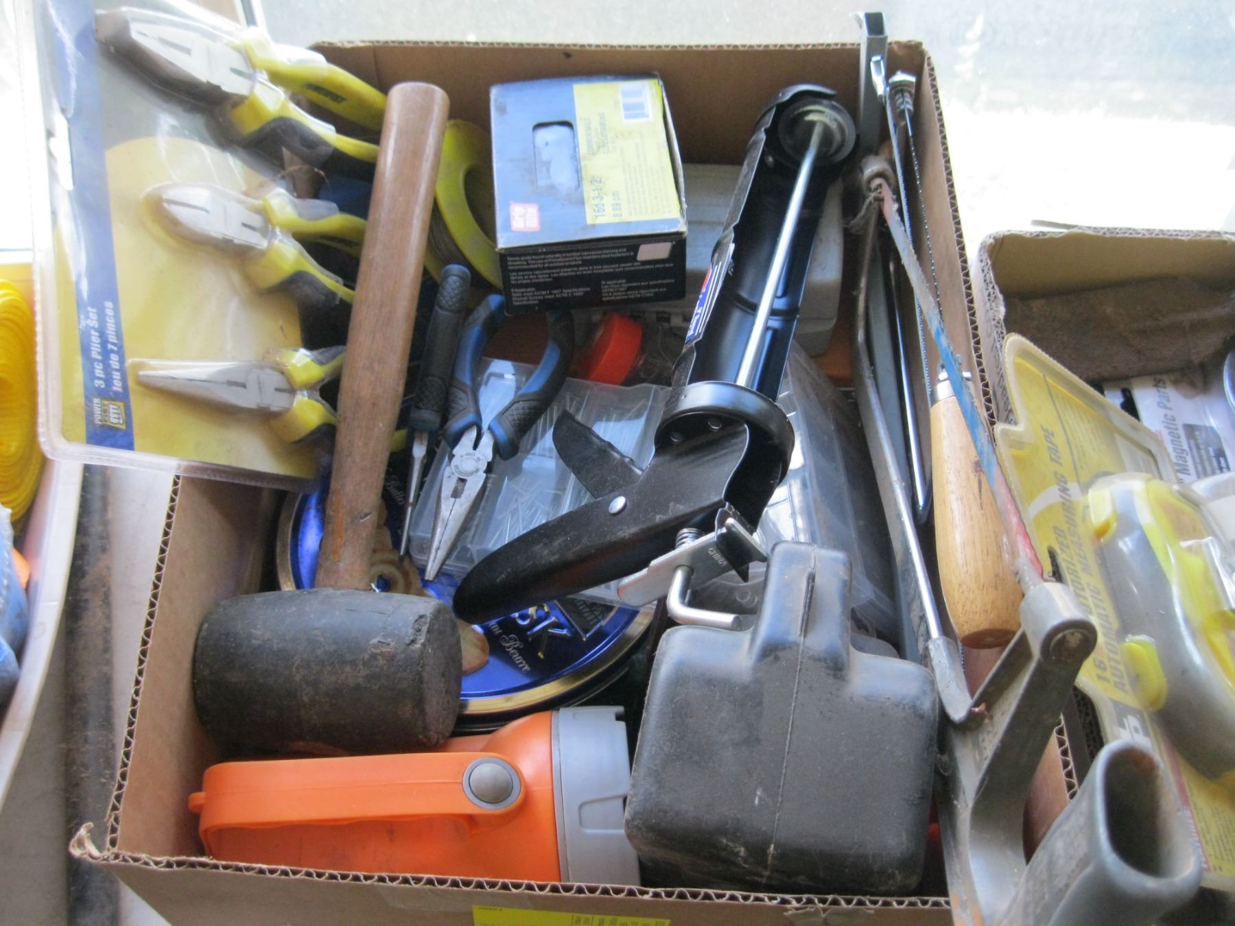 BOX OF MISC. - PLIER SET, FLASHLIGHTS, HACK SAWS, ETC.