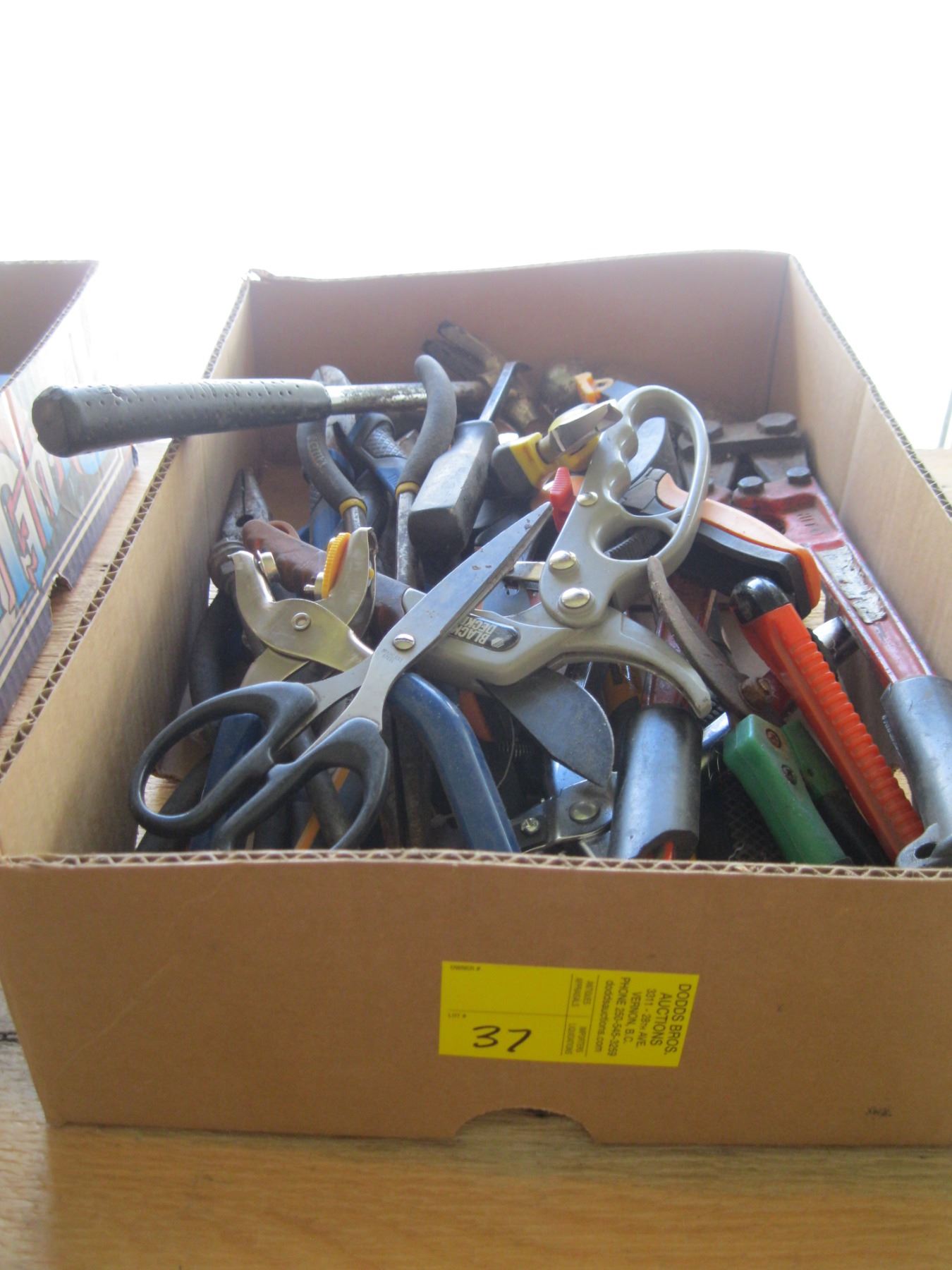BOX OF MISC. - PLIERS, CLIPPERS, BOLT CUTTERS, ETC.