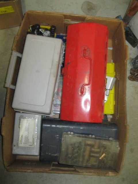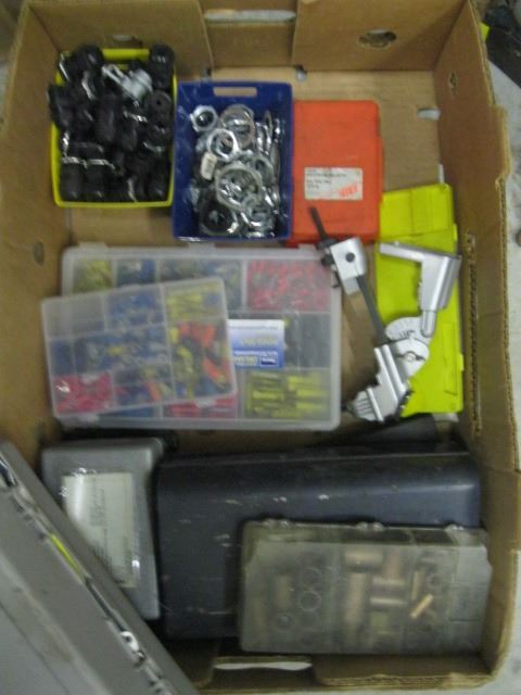 BOX OF MISC. RIVET SET, ELECTRICAL FITTINGS, DRILL BIT SHARPENERS, ETC.