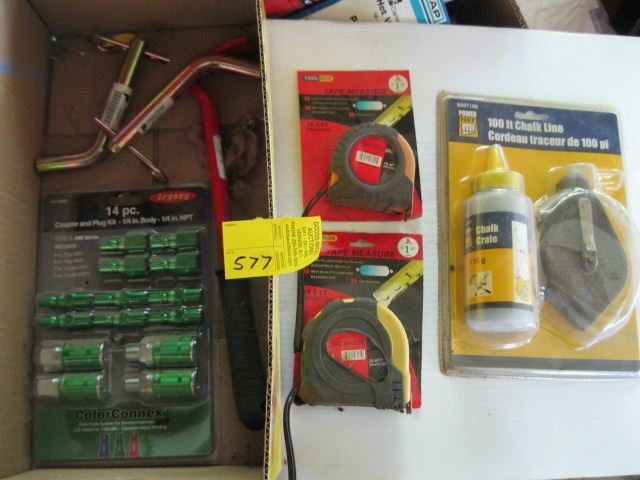 BOX OF MISC. TAPE MEASURES, CHALKLINE, TRAILER PINS, ETC.