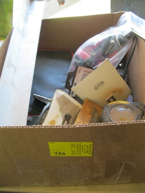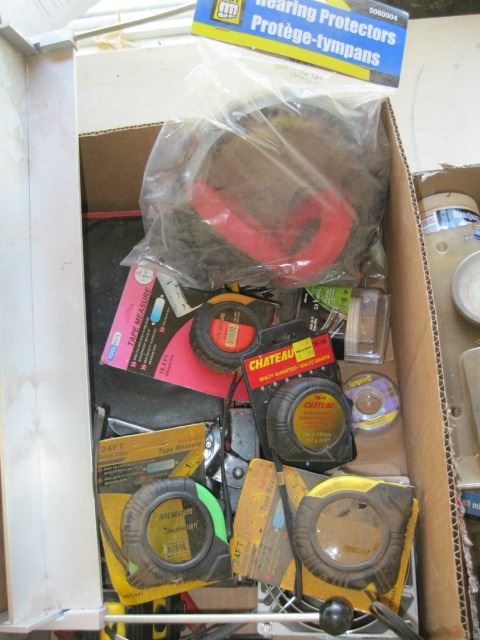 BOX OF MISC. - TAPE MEASURES, FANS, MINI BRAKE, ETC.