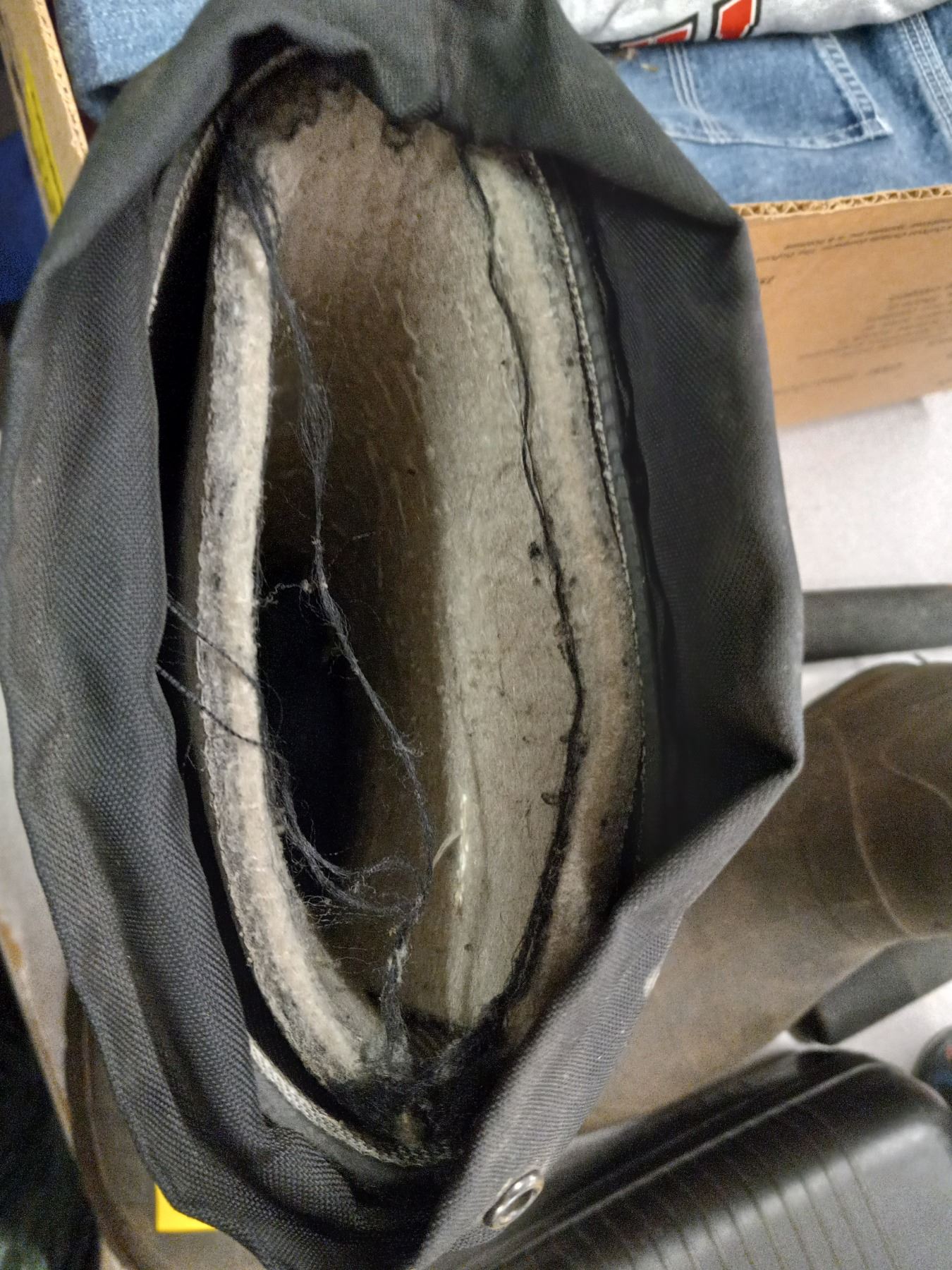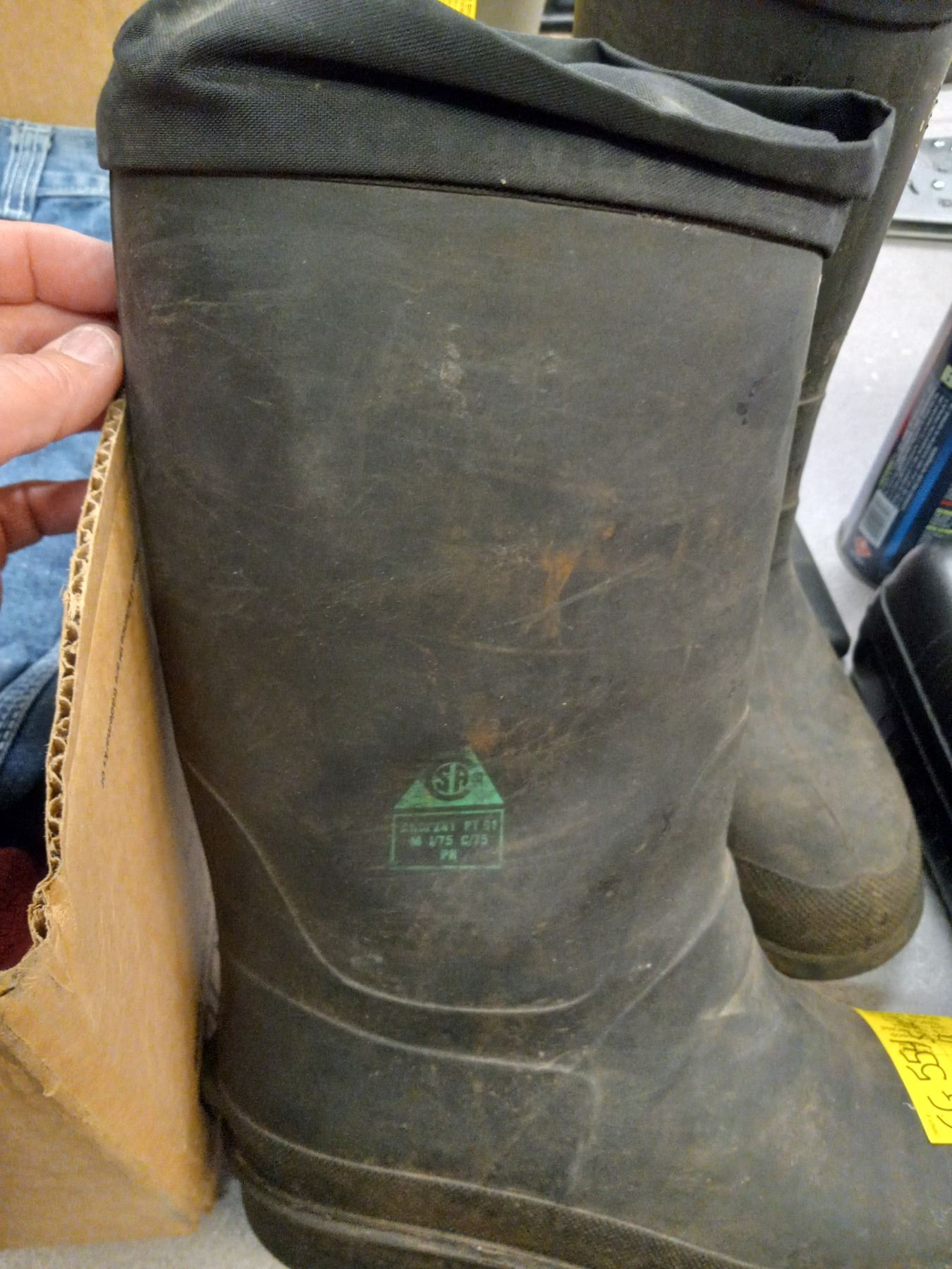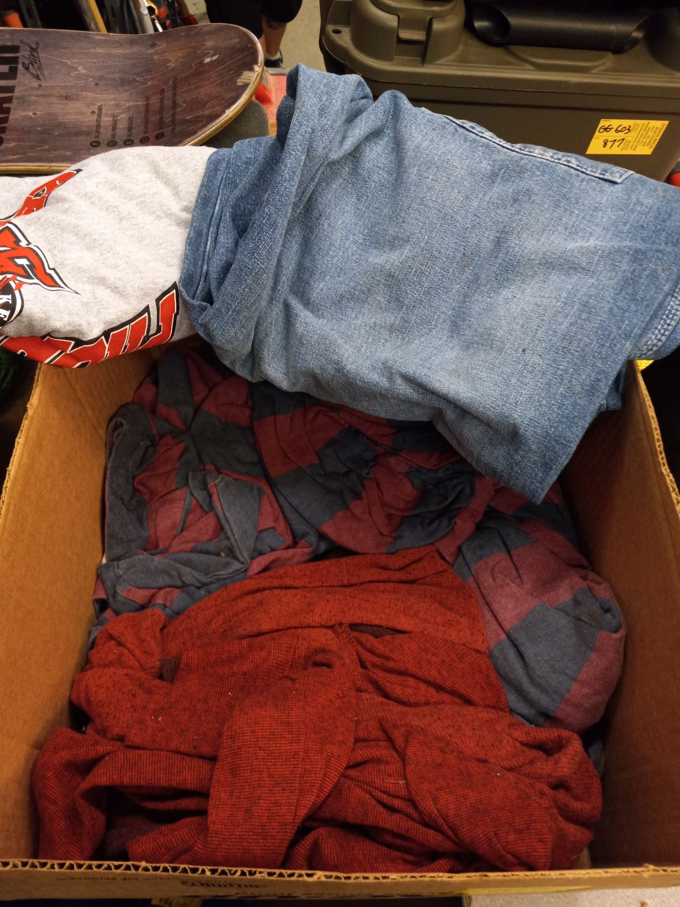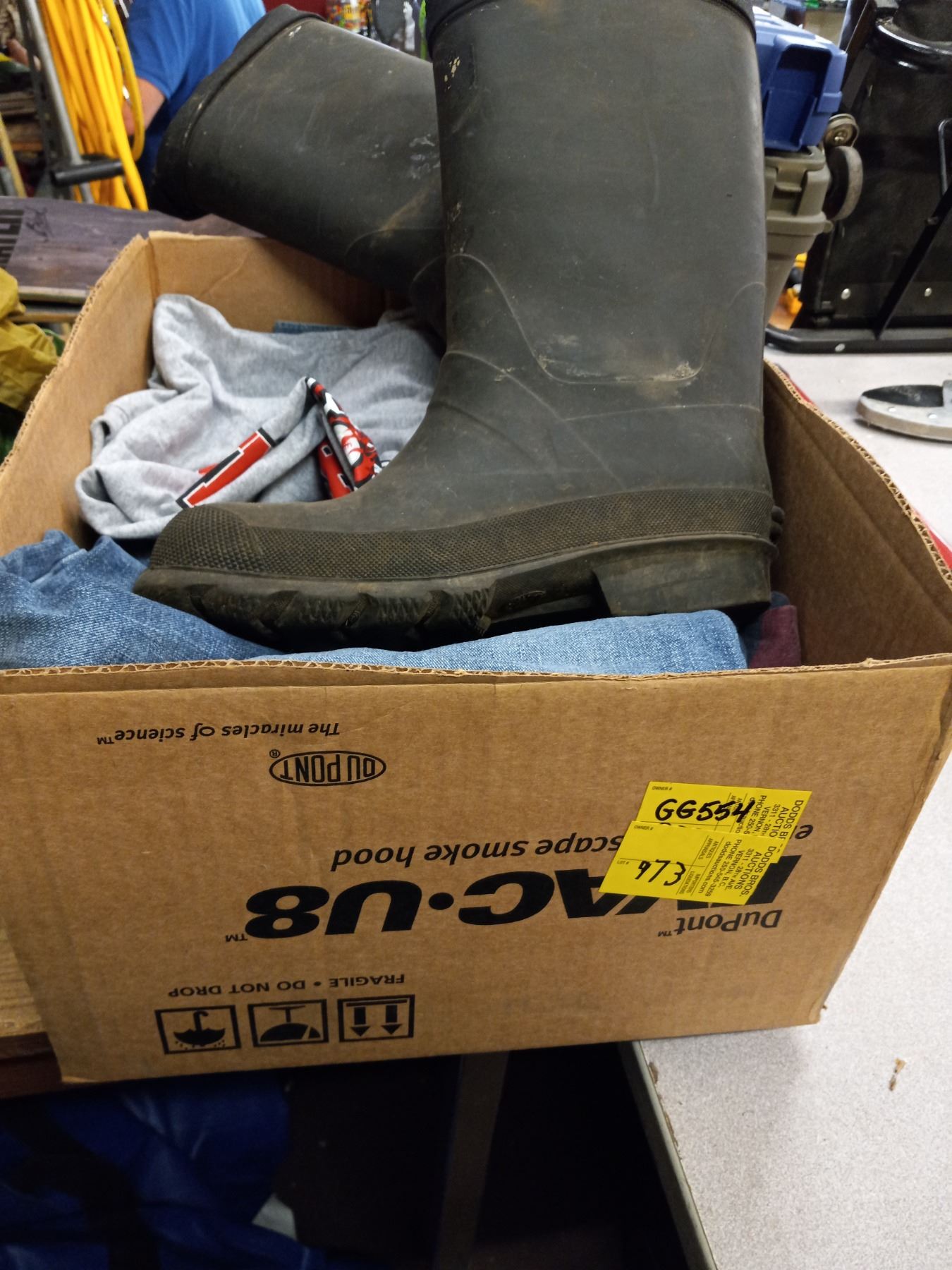 BOX OF SHIRTS, JEANS AND PAIR OF RUBBER BOOTS