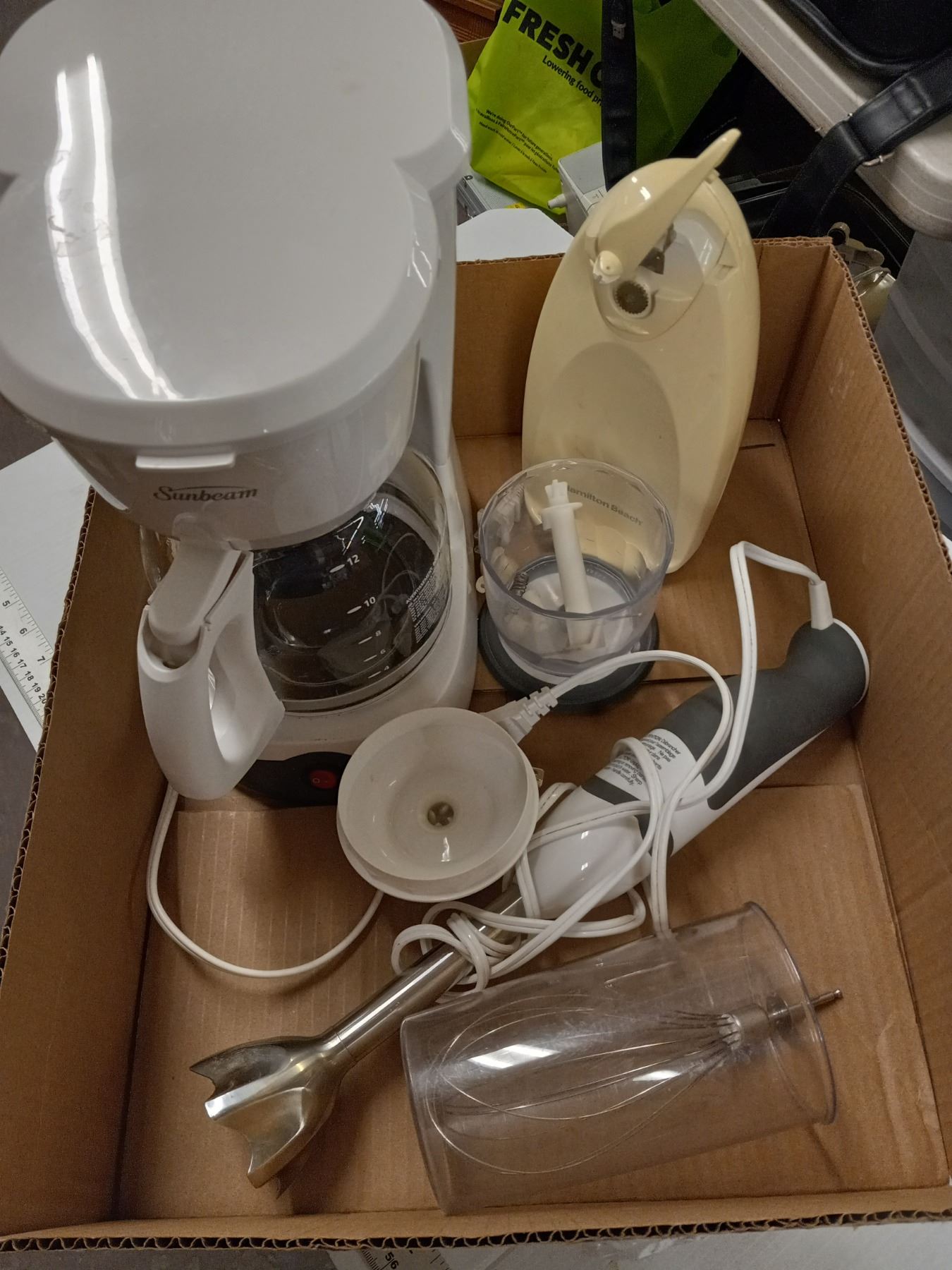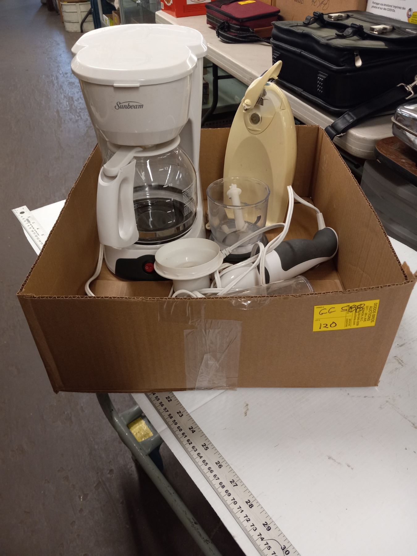 BOX OF SUNBEAM COFFEE MAKER, BRAUN HAND MIXER & ELECTRIC CAN OPENER