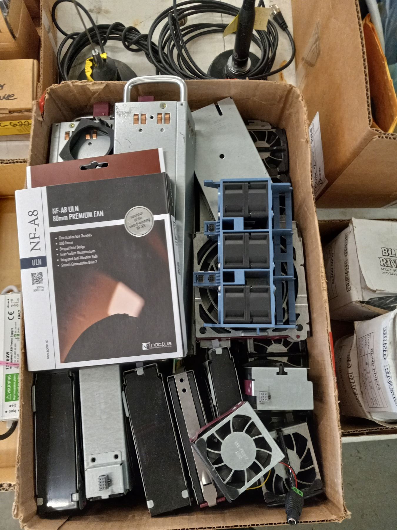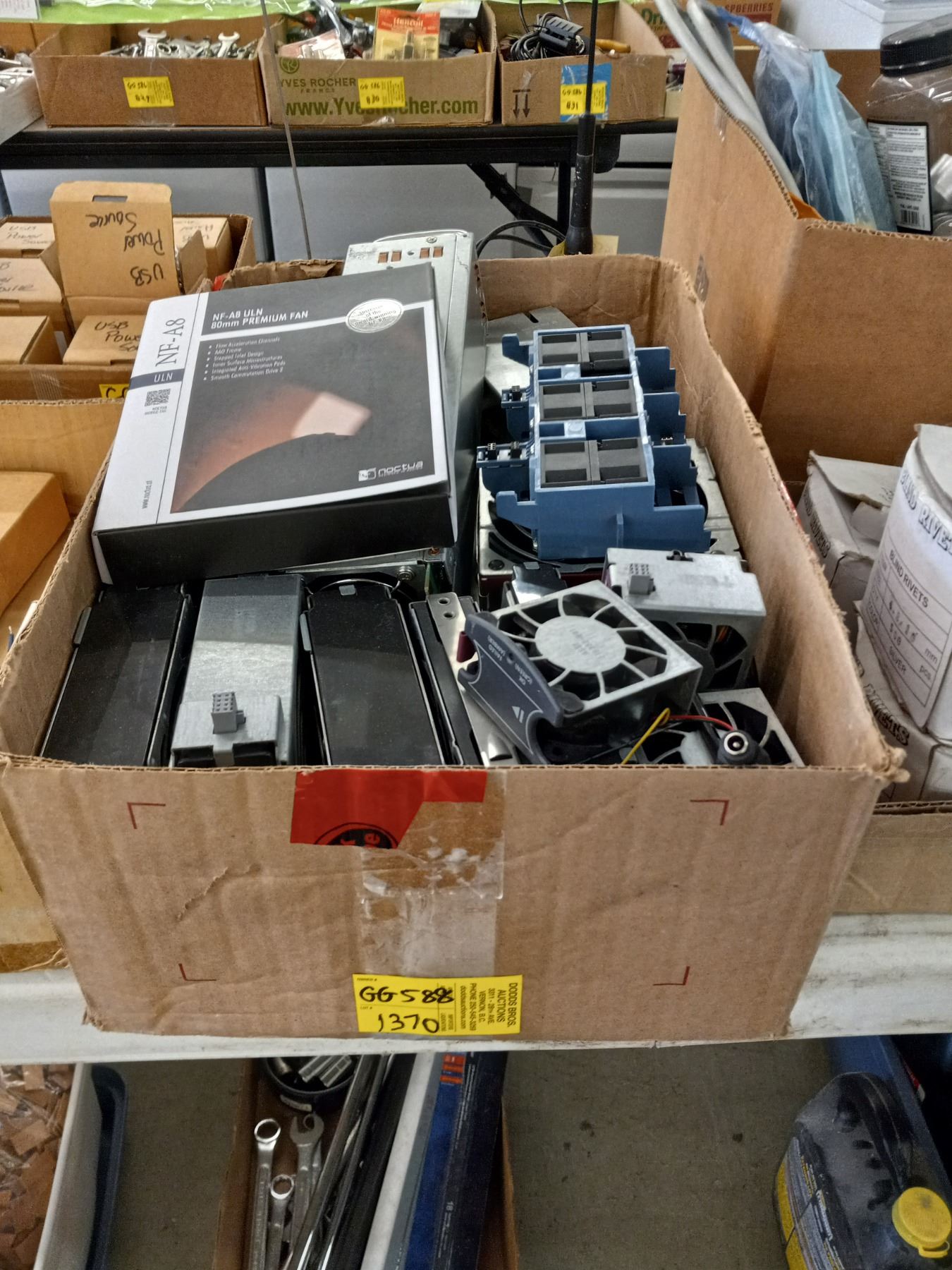 BOX OF VARIOUS TYPES OF COMPUTER FANS, ETC.