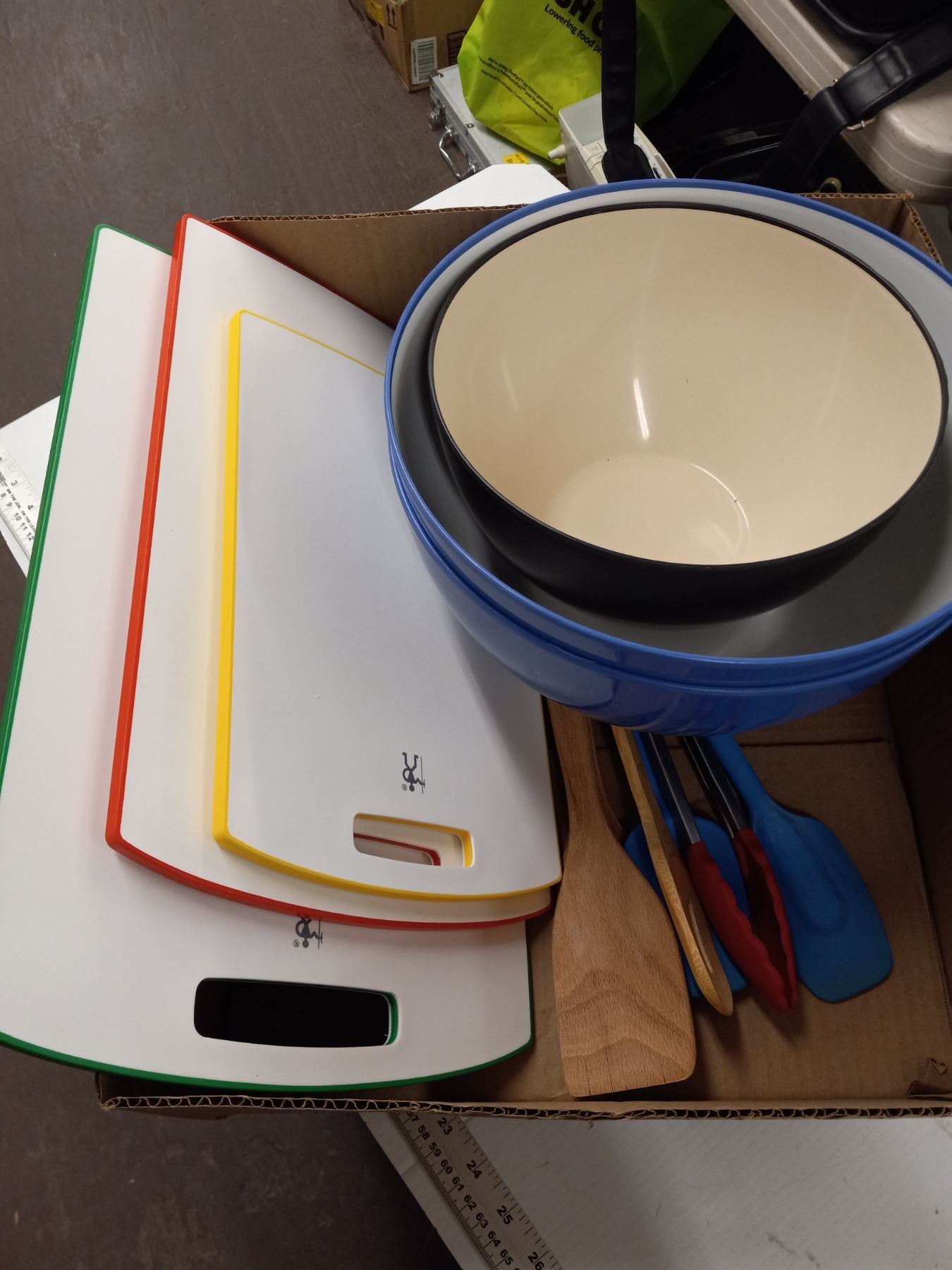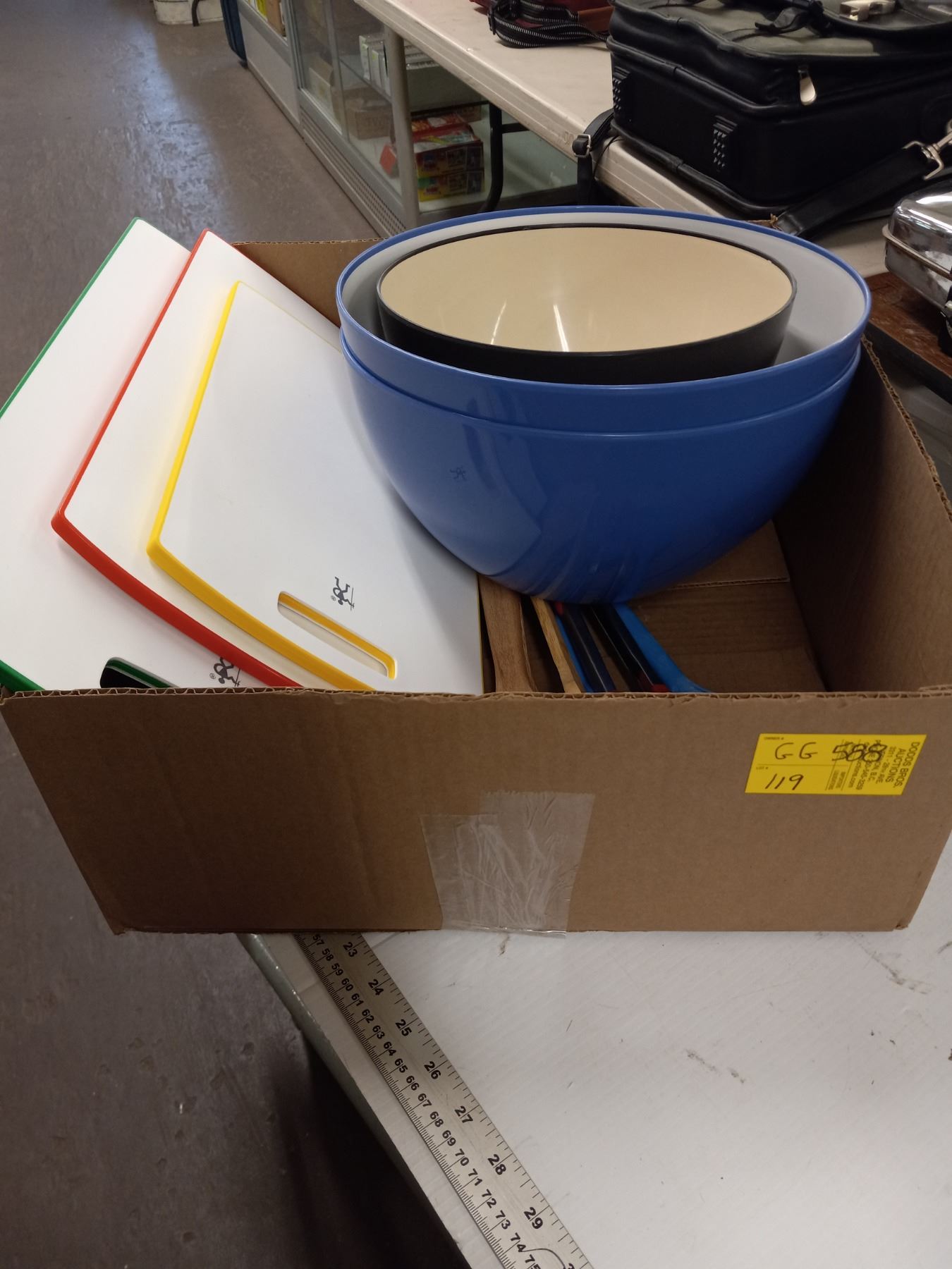 BOX W/3 CUTTING BOARDS, PLASTIC BOWLS & KITCHENWARE