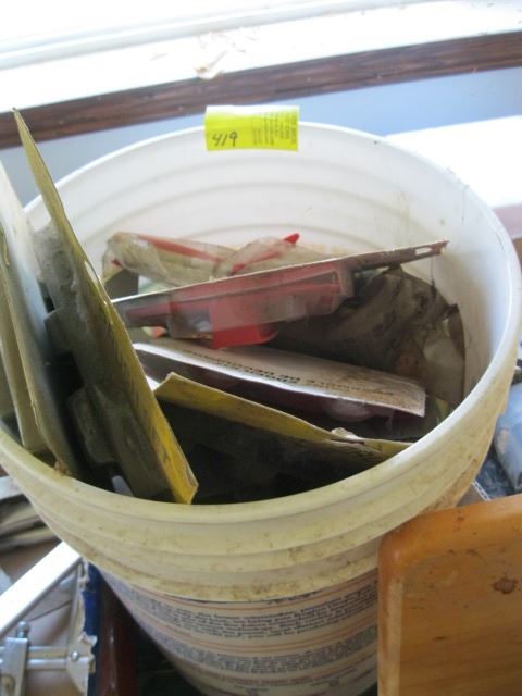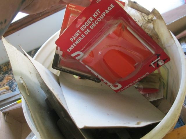 BUCKET OF ASSORTED PAINT BRUSHES & PAINTING SUPPLIES