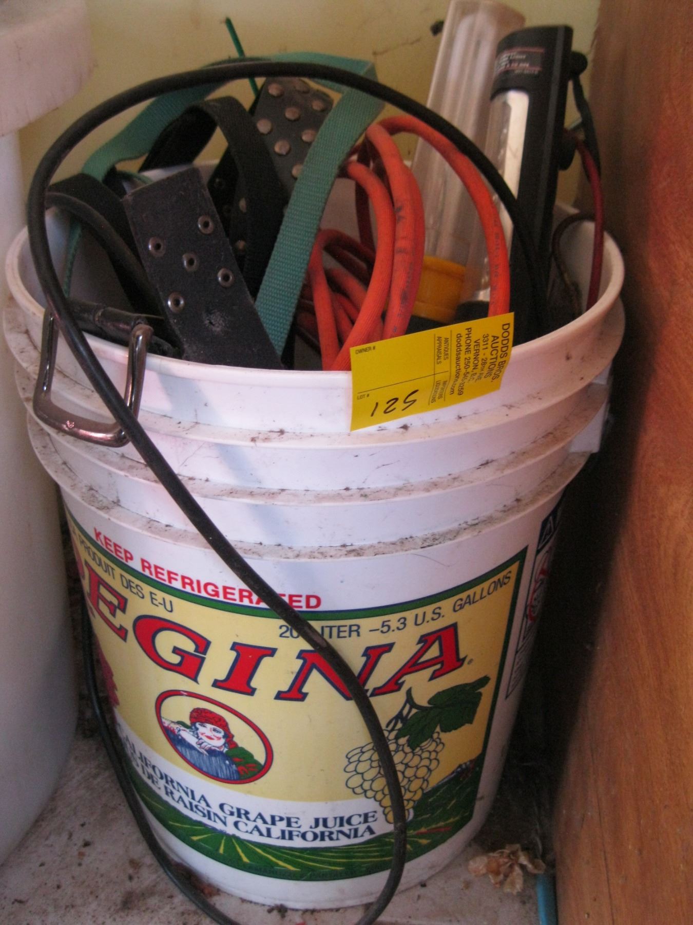 BUCKET OF MISC. - EXTENSION CORDS, TROUBLE LIGHTS, DOG COLLARS, ETC.