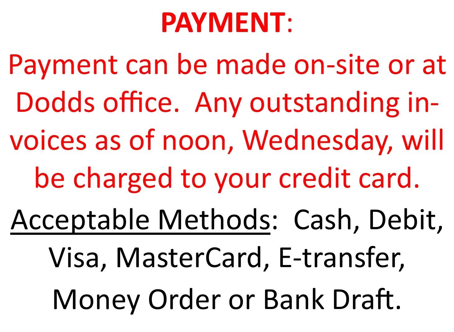 PAYMENT & PICK UP - ONSITE MON/TUES (JULY 11/12) 9:00 am - 4:30 pm. PAYMENT CAN ALSO BE MADE AT DODDS OFFICE, 8:30 AM - 5:00 PM MON/TUES (JULY 11/12).