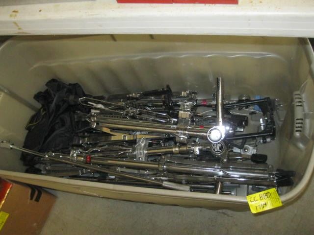 CONTAINER OF ASST. DRUM STANDS, FOOT PEDALS, ETC.