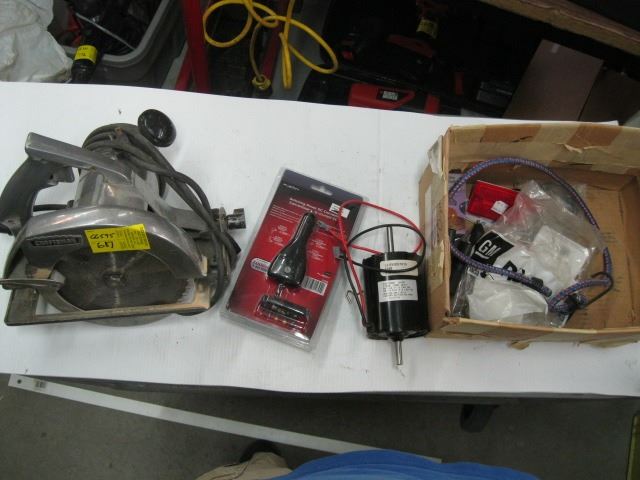 CRAFTSMAN 7 1/4 CIRCULAR SAW AND BOX OF ASSORTED ELECTRIC MOTOR, ETC