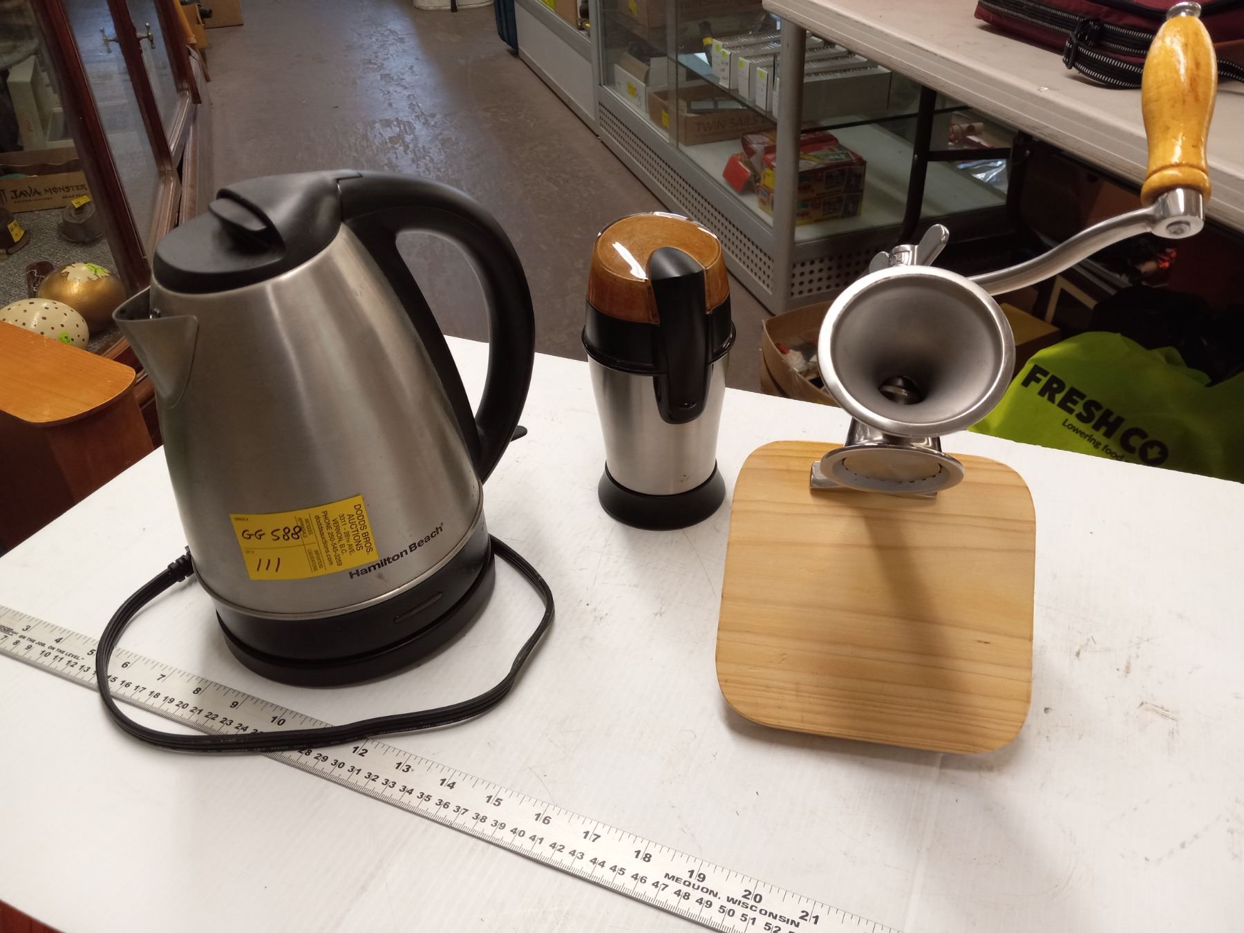 ELECTRIC HAMILTON BEACH KETTLE, COFFEE GRINDER & A SMALL MEAT GRINDER