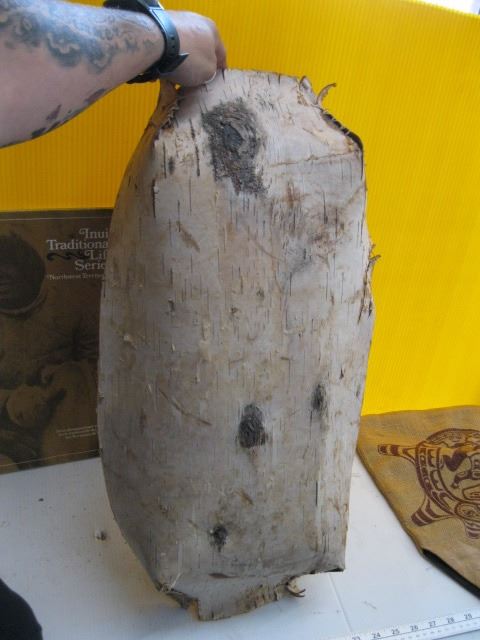 INUIT BIRCHBARK TRAY & A PAINTED SACK & INUIT LIFE SERIES PHOTOGRAPHS