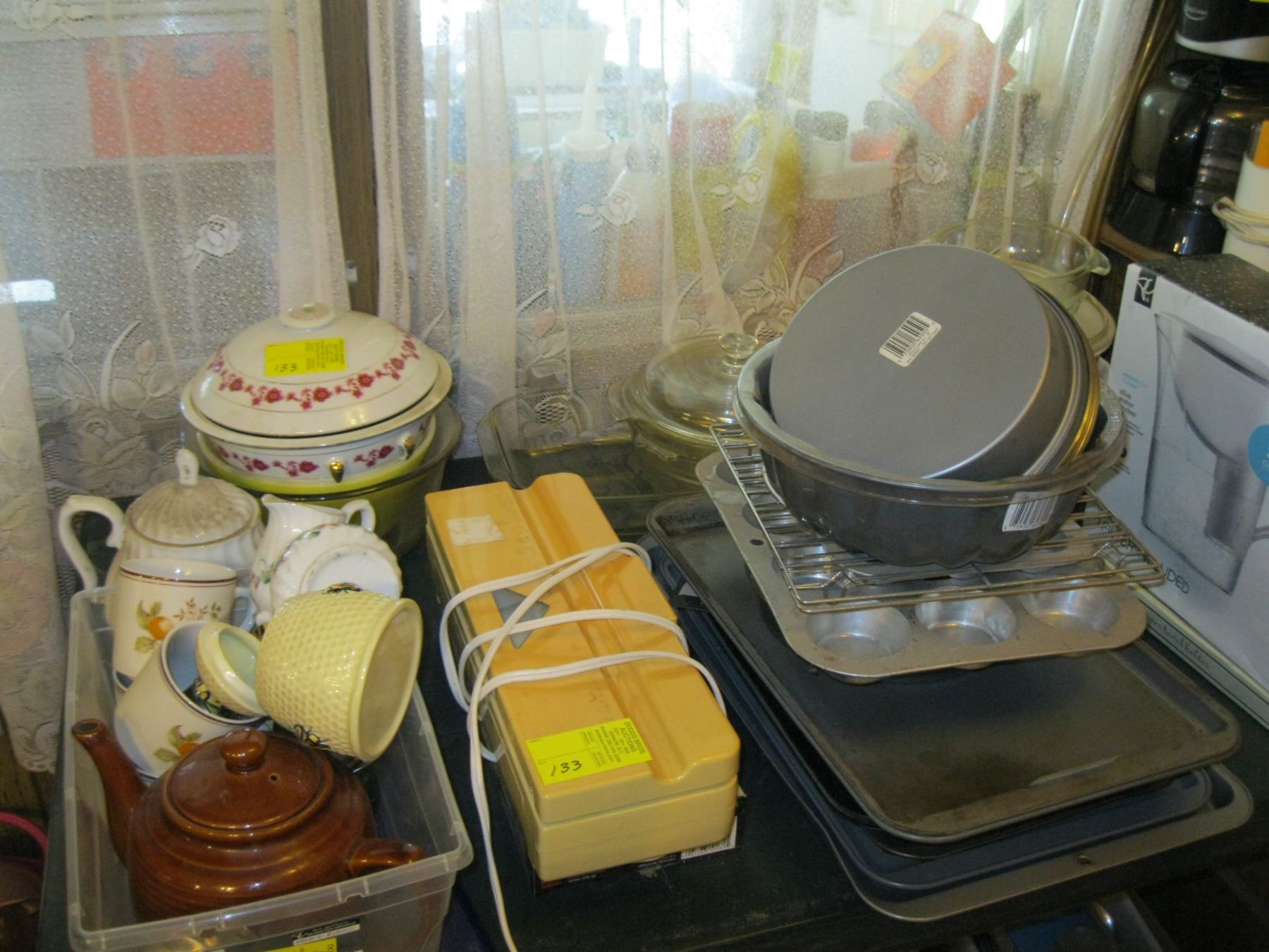 LARGE LOT OF MISC. KITCHEN ITEMS - TEAPOTS, BAKING SHEETS, WATER CONTAINER, ETC.