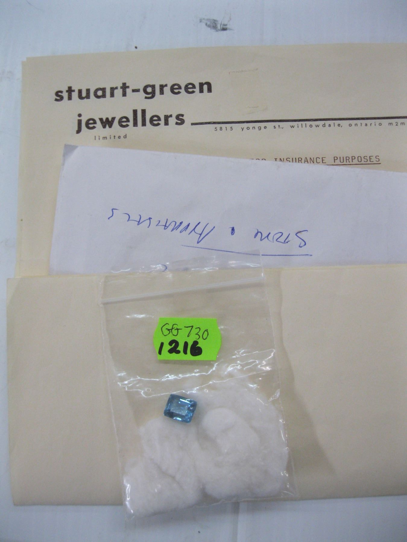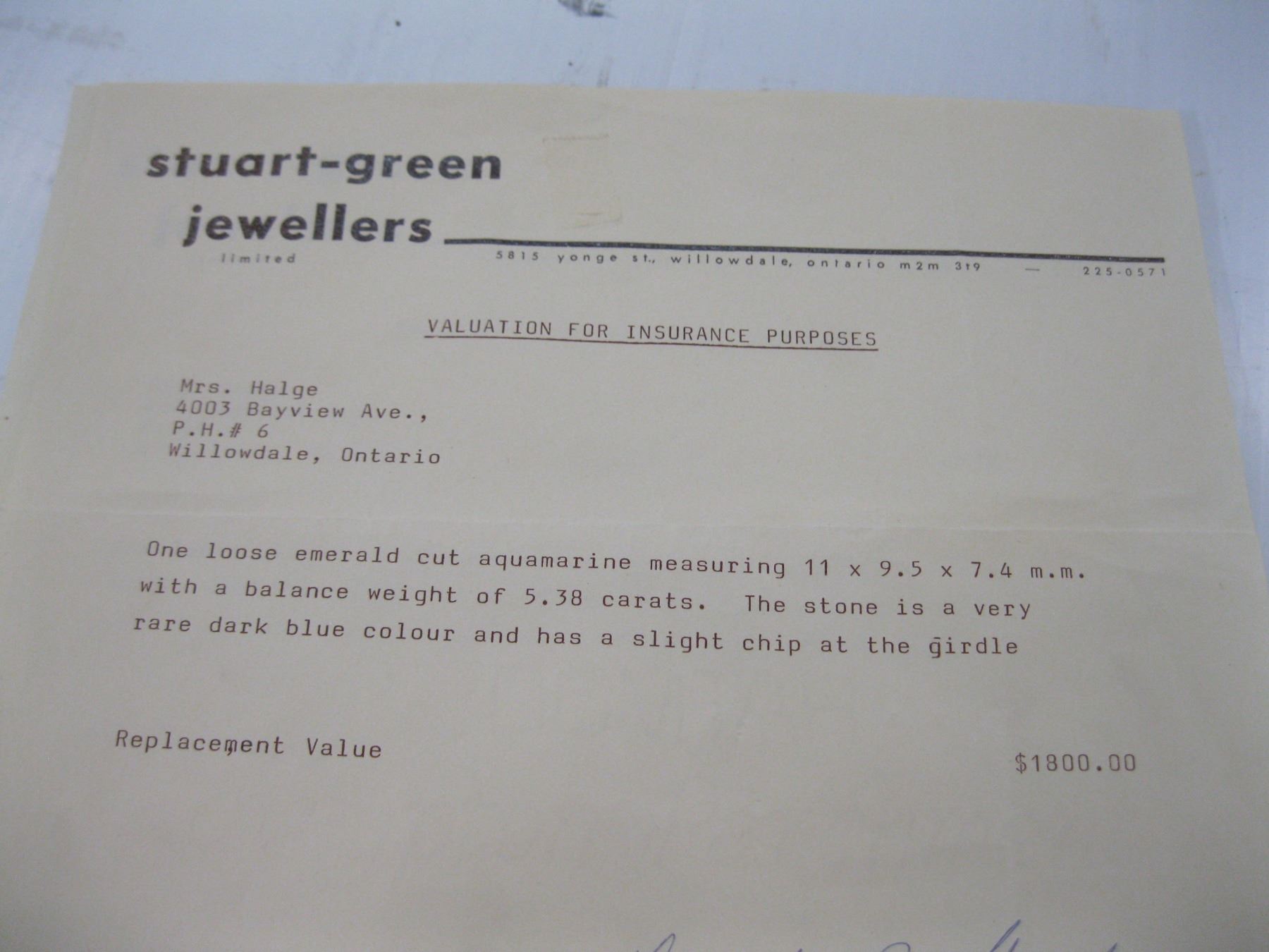 LG. AQUA MARINE EMERALD CUT STONE, 5.38K, W/APPRAISAL VALUED AT $1800