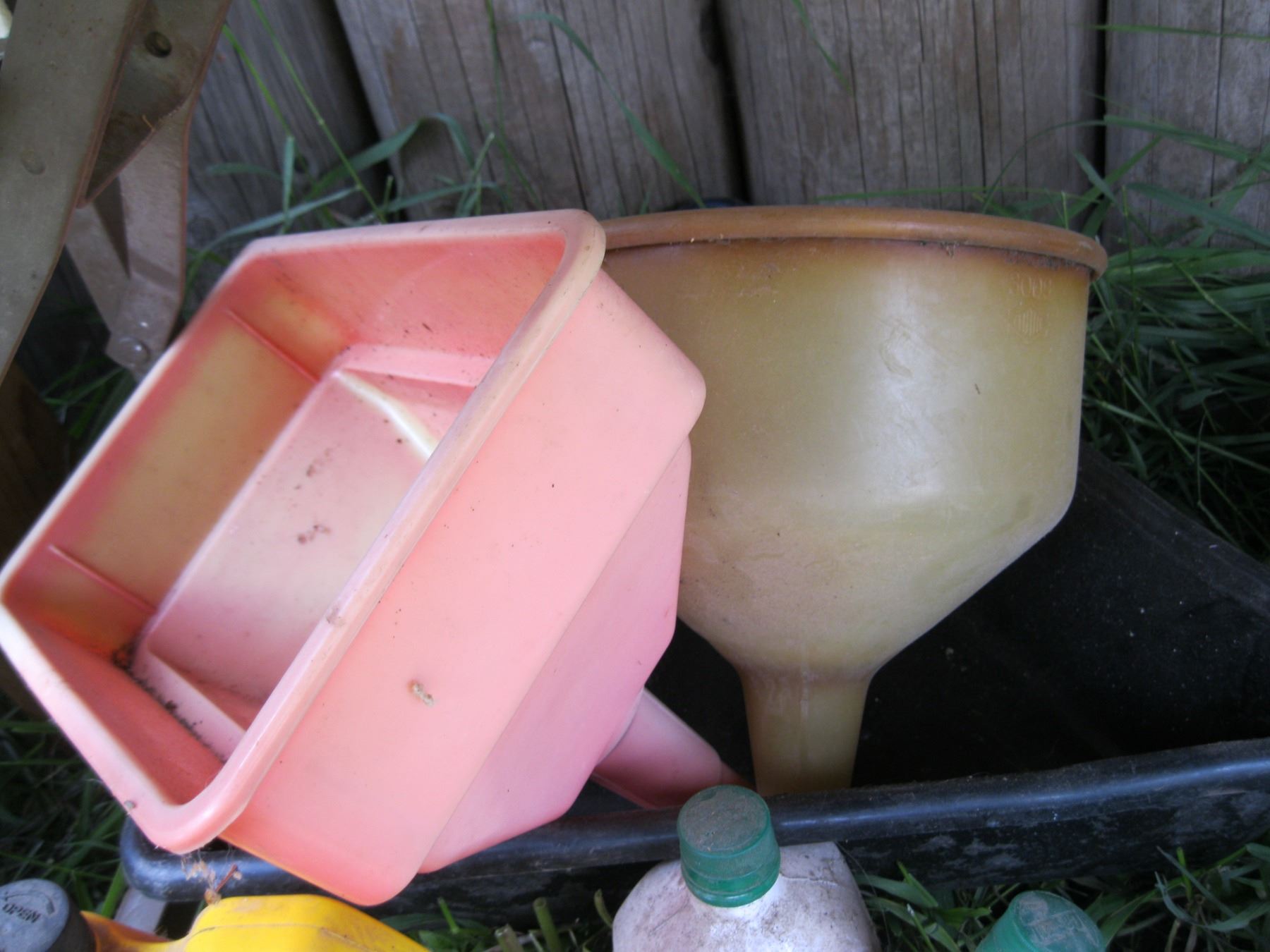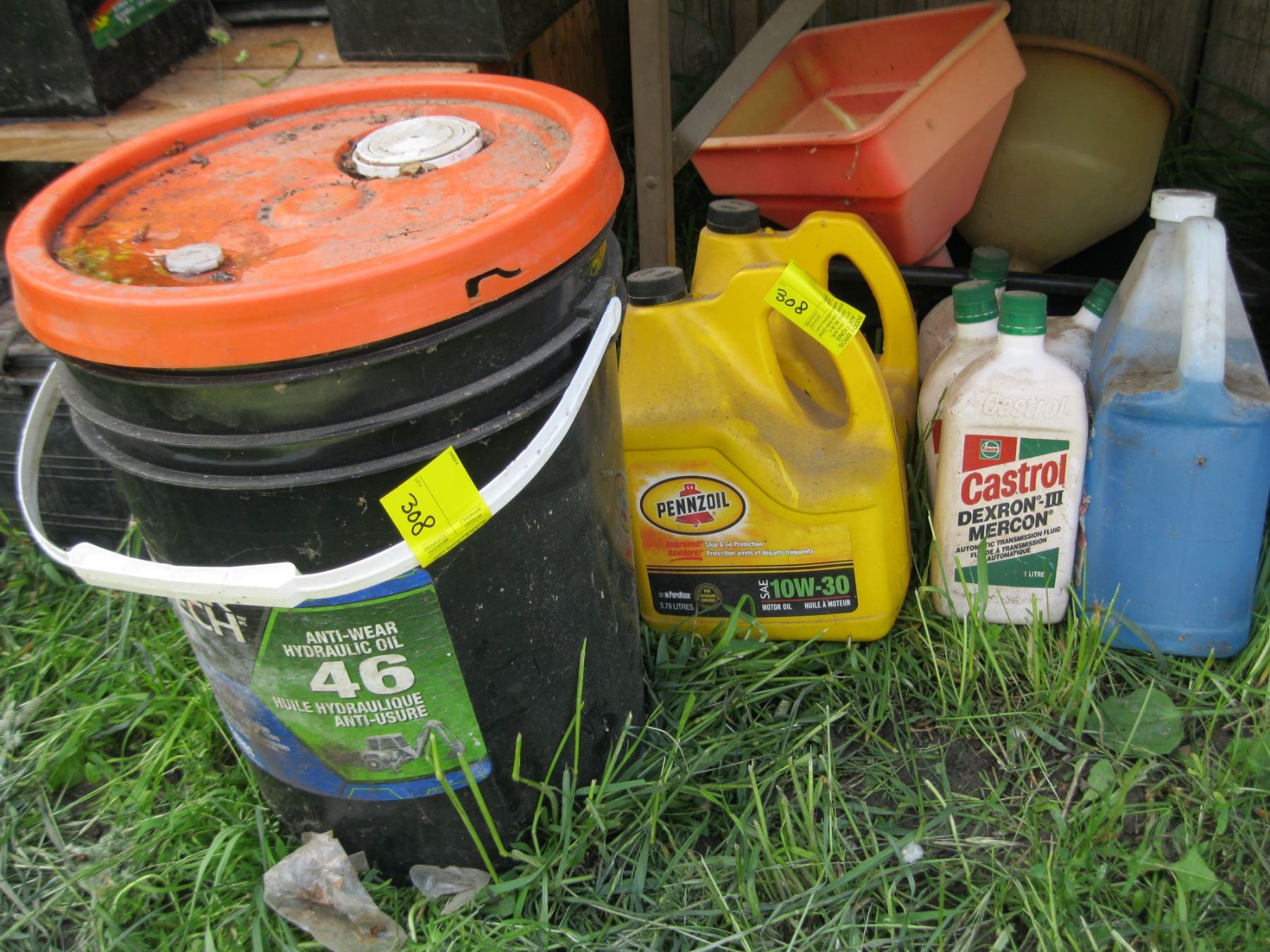 LOT OF ASSORTED OILS, WINDSHIELD WASHER FLUID, FUNNELS, ETC.
