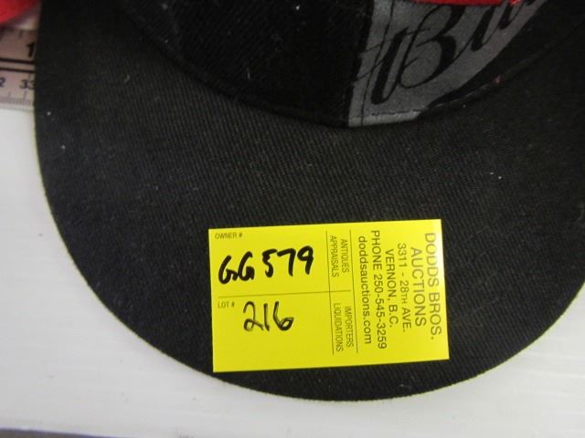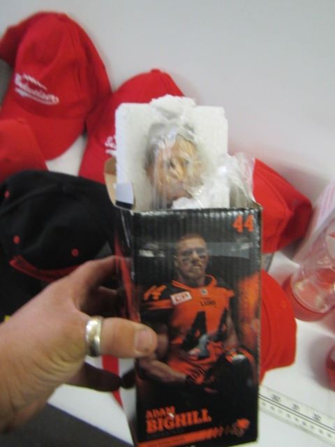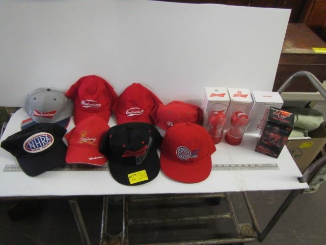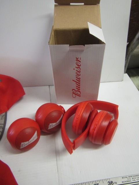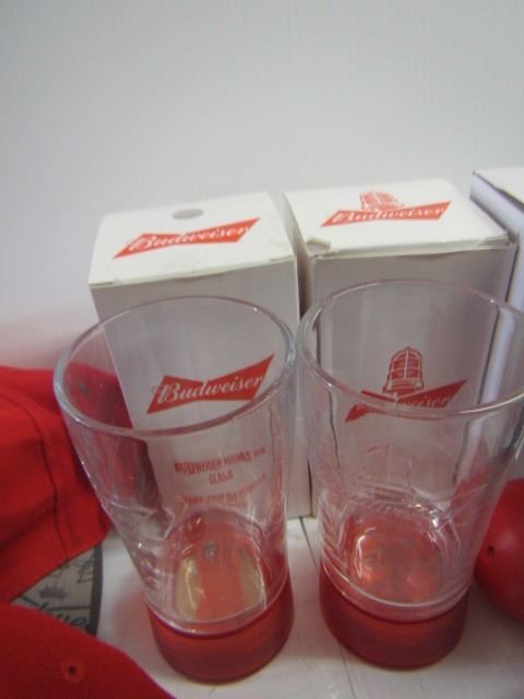 LOT OF BUDWEISER GLASSES, HATS, SPEAKERS AND BC LIONS FIGURINE