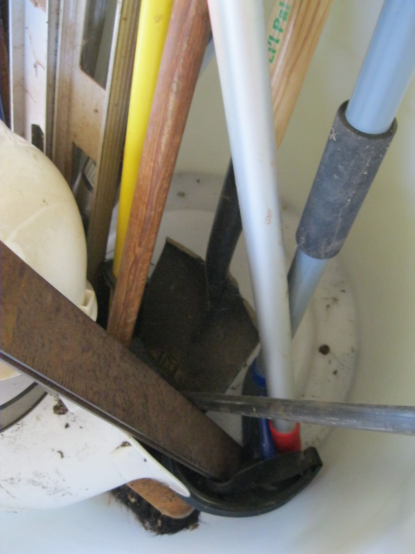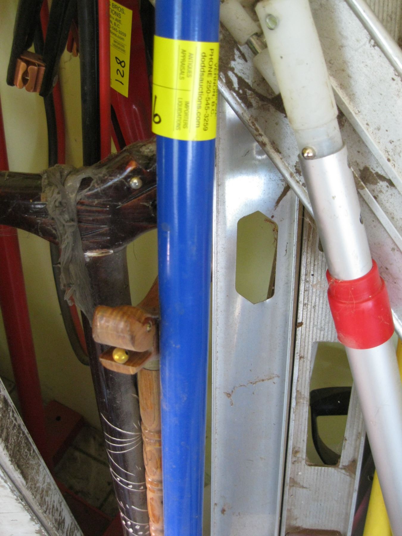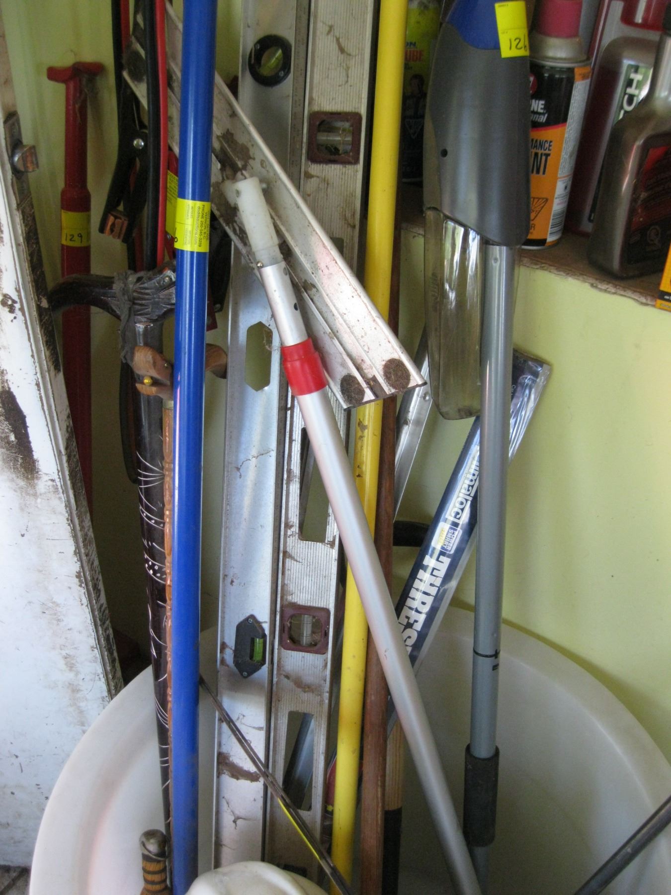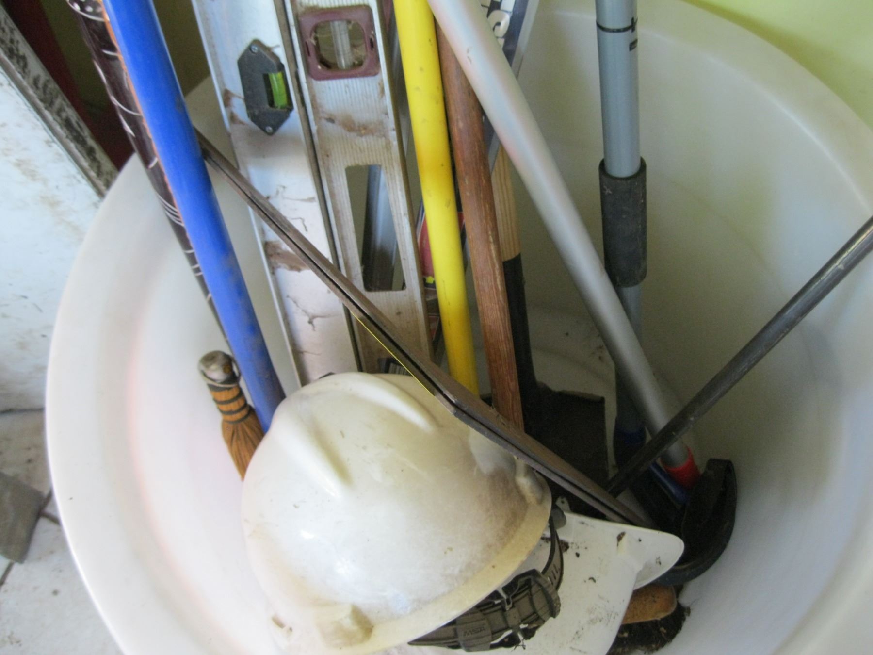 LOT OF MISC. - LEVELS, DOOR SWEEPS, PANES, OLD METAL DETECTOR, ETC.