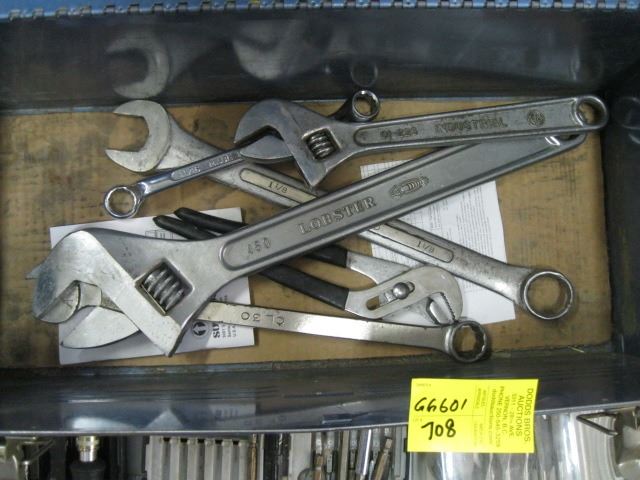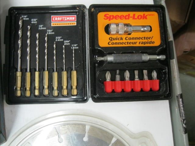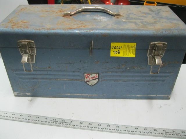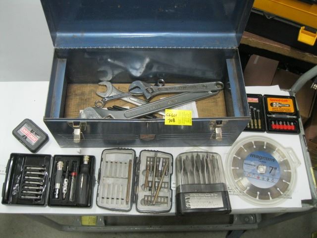 METAL BEACH TOOL BOX WITH 15 PCE WOOD SPADE BIT SET, WRENCHES ETC