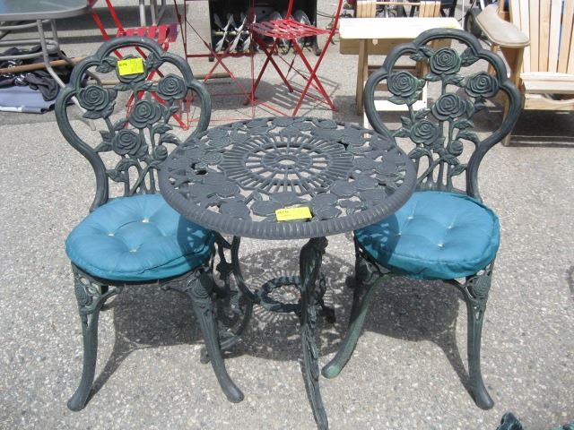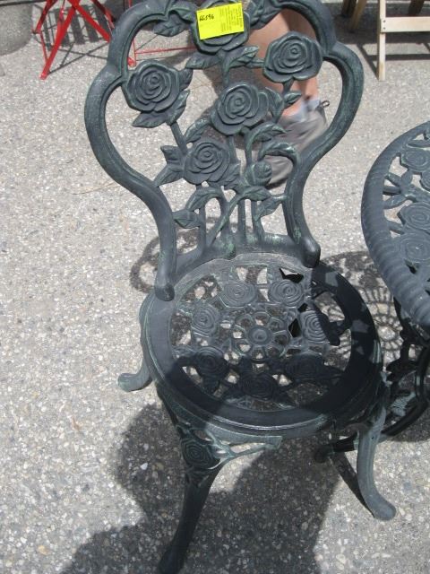 METAL BISTRO TABLE AND TWO CHAIRS