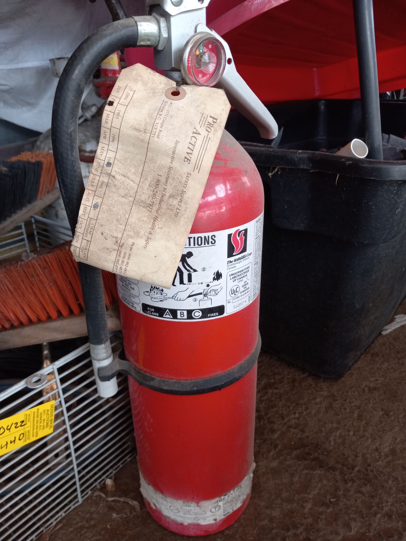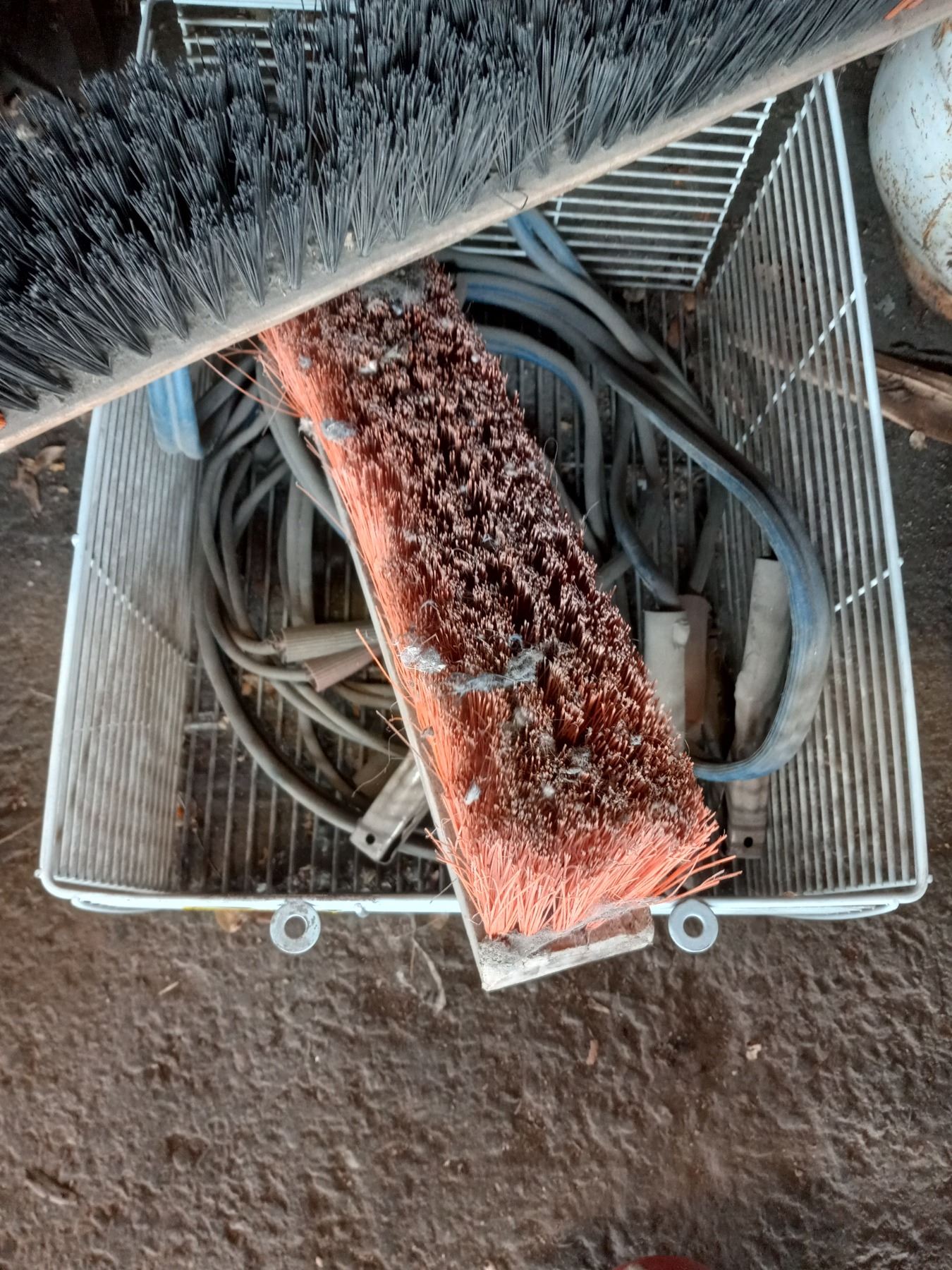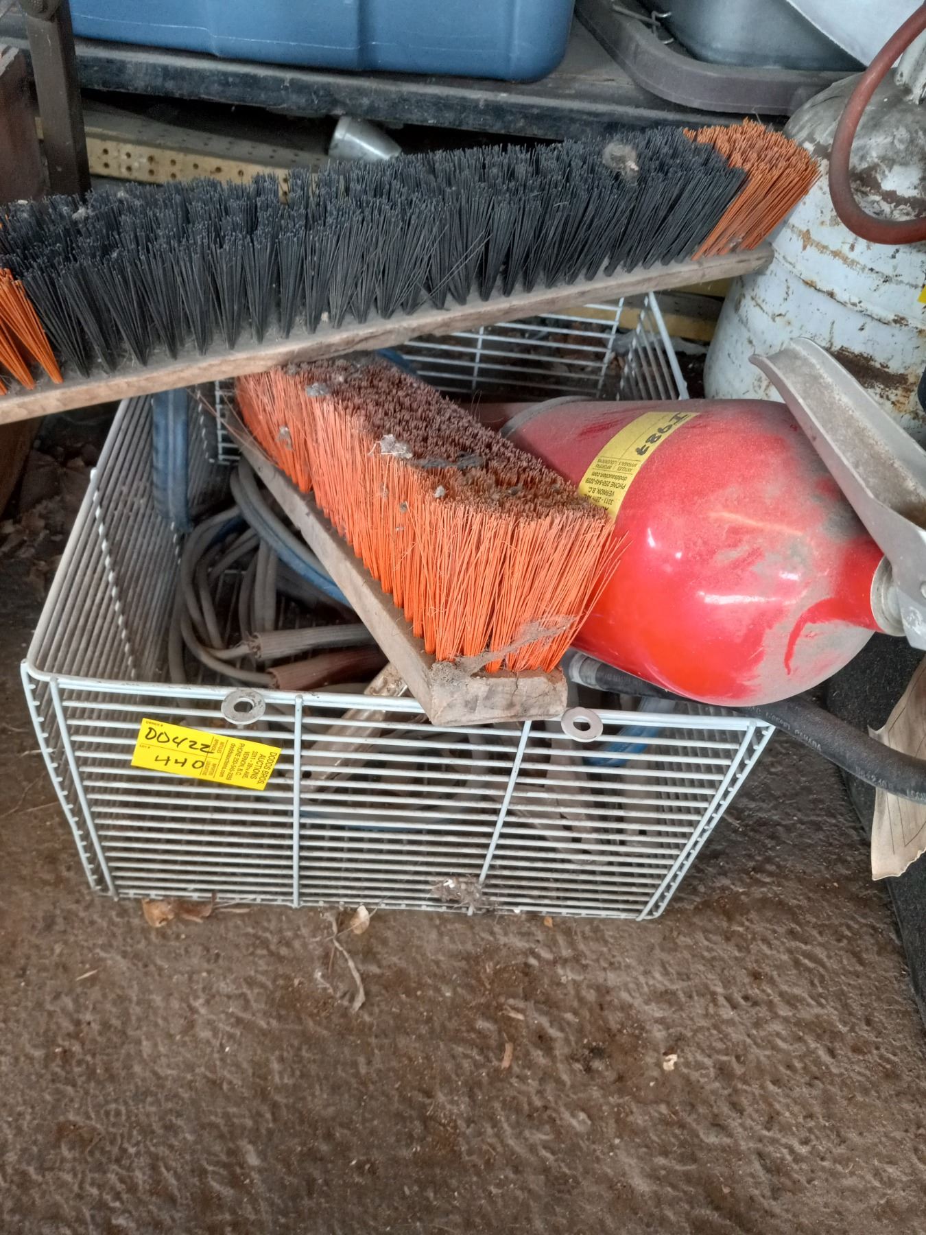 METAL CRATE WITH FIRE EXTINGUISHER, PUSH BROOM HEADS, JUMPER CABLES ETC.
