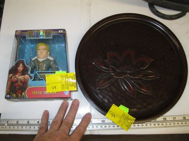 METAL DIECAST WONDER WOMAN FIGURINE OF STEVE TREVOR & A WOODEN CARVED PLATE