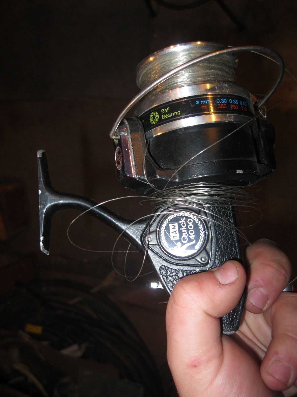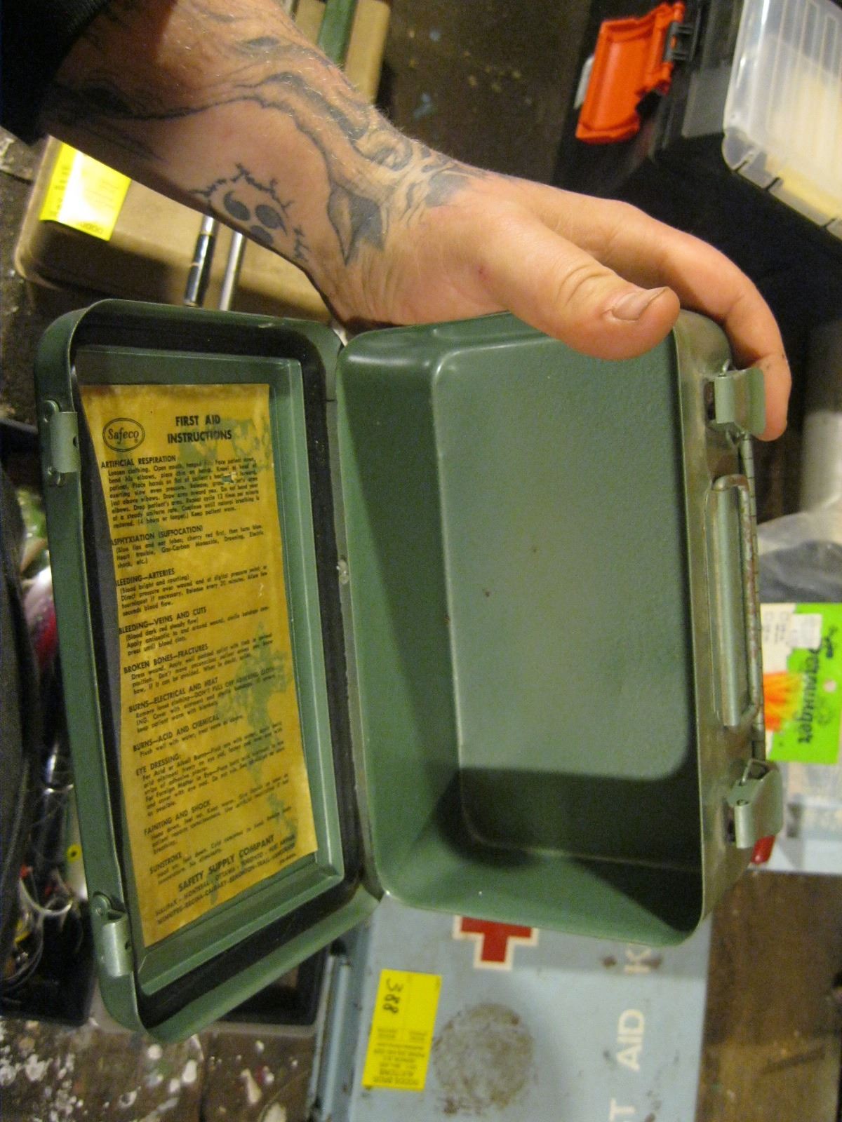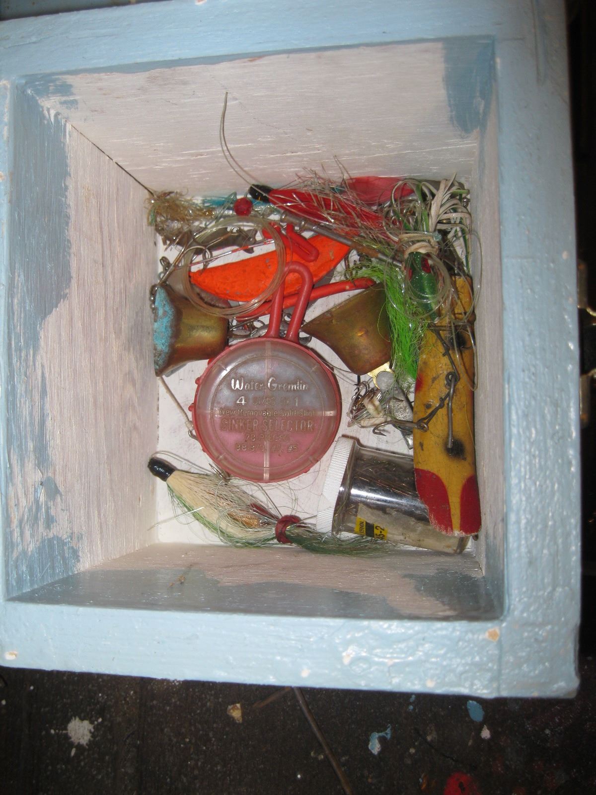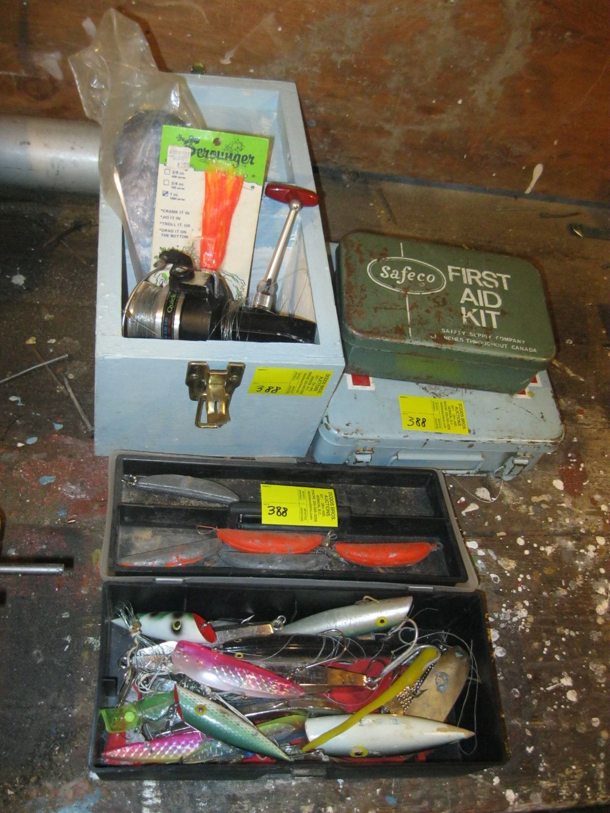 MISC. FISHING TACKLE, SPINNING REEL, 2 EMPTY FIRST AID BOXES, ETC.